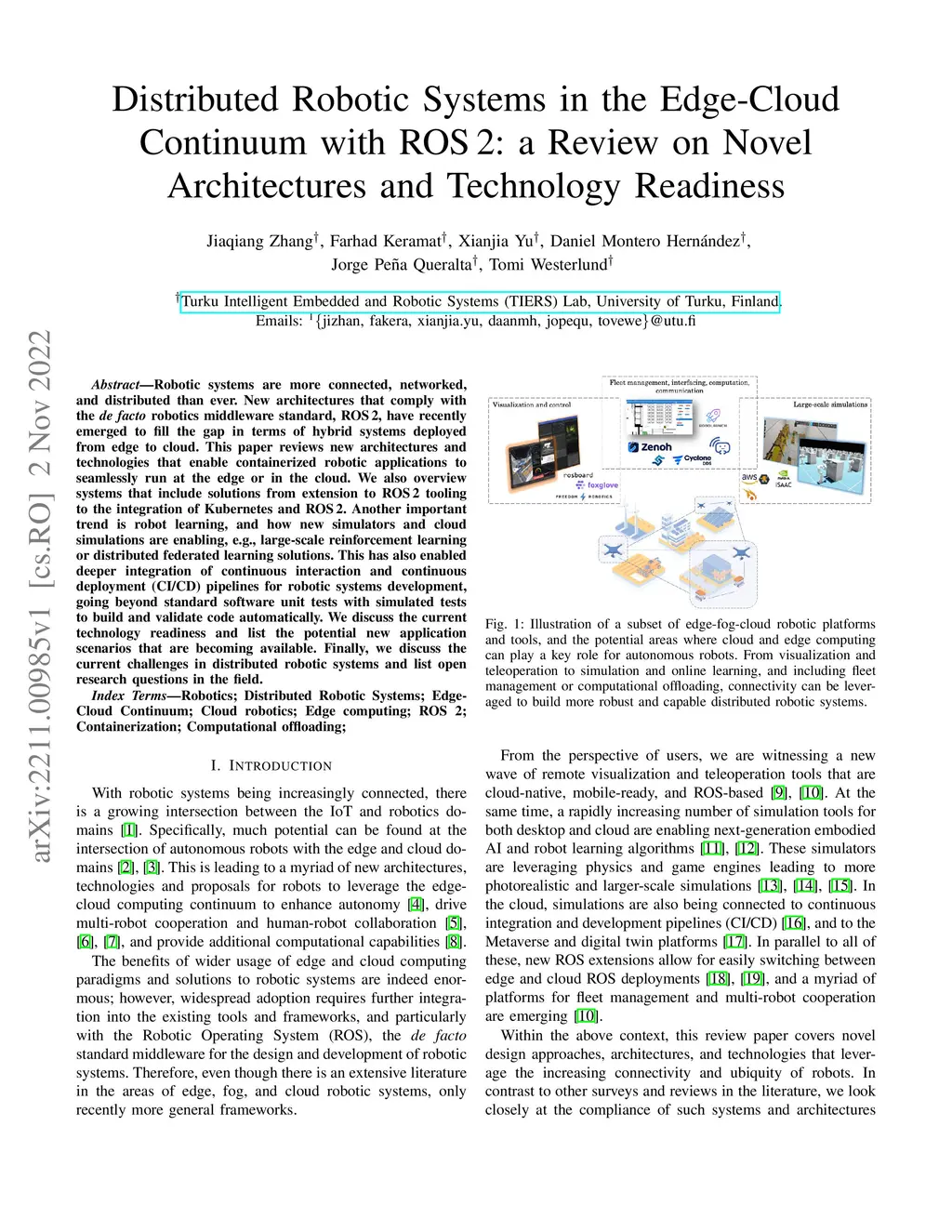 Robotic systems are more connected, networked, and distributed than ever. New architectures that comply with the \textit{de facto} robotics middleware standard, ROS\,2, have recently emerged to fill the gap in terms of hybrid systems deployed from edge to cloud. This paper reviews new architectures and technologies that enable containerized robotic applications to seamlessly run at the edge or in the cloud. We also overview systems that include solutions from extension to ROS\,2 tooling to the integration of Kubernetes and ROS\,2. Another important trend is robot learning, and how new simulators and cloud simulations are enabling, e.g., large-scale reinforcement learning or distributed federated learning solutions. This has also enabled deeper integration of continuous interaction and continuous deployment (CI/CD) pipelines for robotic systems development, going beyond standard software unit tests with simulated tests to build and validate code automatically. We discuss the current technology readiness and list the potential new application scenarios that are becoming available. Finally, we discuss the current challenges in distributed robotic systems and list open research questions in the field.