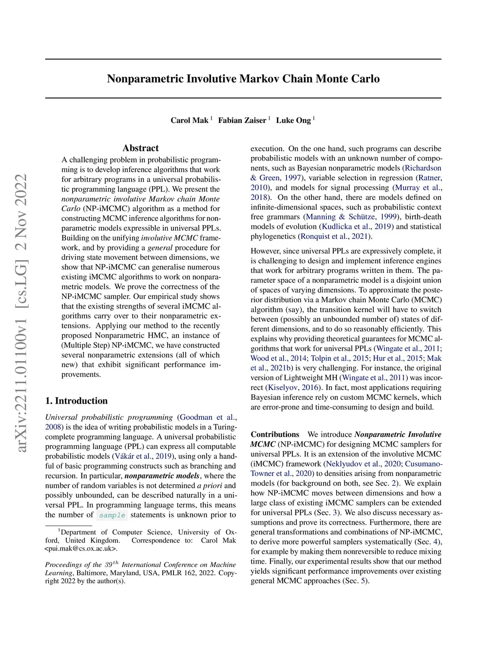 A challenging problem in probabilistic programming is to develop inference algorithms that work for arbitrary programs in a universal probabilistic programming language (PPL). We present the nonparametric involutive Markov chain Monte Carlo (NP-iMCMC) algorithm as a method for constructing MCMC inference algorithms for nonparametric models expressible in universal PPLs. Building on the unifying involutive MCMC framework, and by providing a general procedure for driving state movement between dimensions, we show that NP-iMCMC can generalise numerous existing iMCMC algorithms to work on nonparametric models. We prove the correctness of the NP-iMCMC sampler. Our empirical study shows that the existing strengths of several iMCMC algorithms carry over to their nonparametric extensions. Applying our method to the recently proposed Nonparametric HMC, an instance of (Multiple Step) NP-iMCMC, we have constructed several nonparametric extensions (all of which new) that exhibit significant performance improvements.