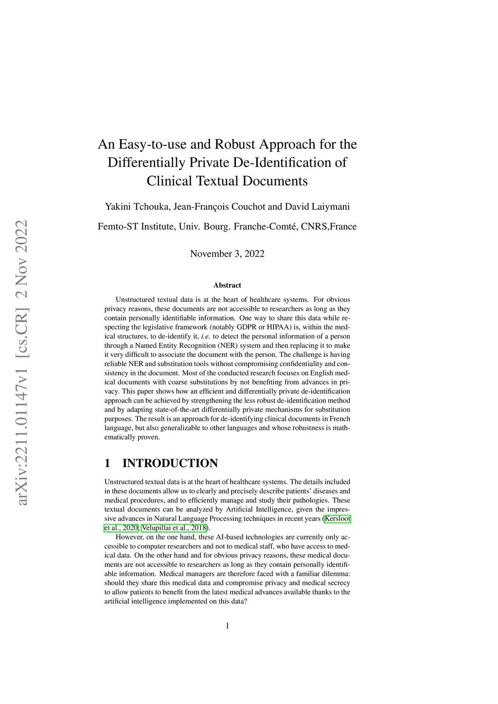 Unstructured textual data is at the heart of healthcare systems. For obvious privacy reasons, these documents are not accessible to researchers as long as they contain personally identifiable information. One way to share this data while respecting the legislative framework (notably GDPR or HIPAA) is, within the medical structures, to de-identify it, i.e. to detect the personal information of a person through a Named Entity Recognition (NER) system and then replacing it to make it very difficult to associate the document with the person. The challenge is having reliable NER and substitution tools without compromising confidentiality and consistency in the document. Most of the conducted research focuses on English medical documents with coarse substitutions by not benefiting from advances in privacy. This paper shows how an efficient and differentially private de-identification approach can be achieved by strengthening the less robust de-identification method and by adapting state-of-the-art differentially private mechanisms for substitution purposes. The result is an approach for de-identifying clinical documents in French language, but also generalizable to other languages and whose robustness is mathematically proven.