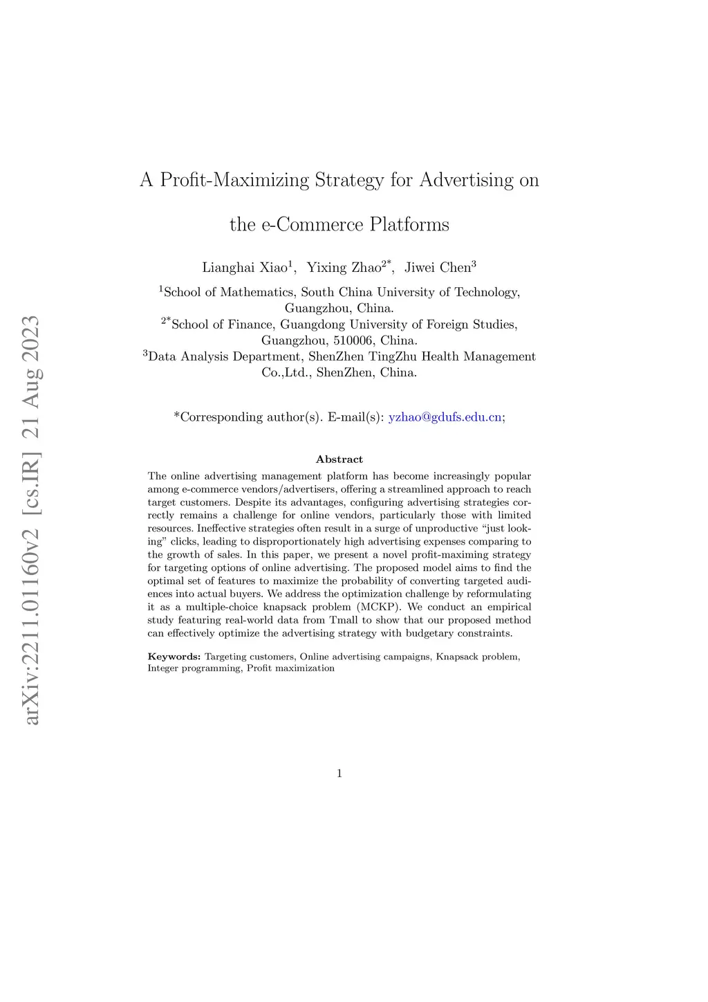 Ads manager platform gains popularity among numerous e-commercial vendors/advertisers. It helps advertisers to facilitate the process of displaying their ads to target customers. One of the main challenges faced by advertisers, especially small and medium-sized enterprises, is to configure their advertising strategy properly. An ineffective advertising strategy will bring too many ``just looking'' clicks and, eventually, generate high advertising expenditure unproportionally to the growth of sales. In this paper, we present a novel profit-maximization model for online advertising optimization. The optimization problem is constructed to find optimal set of features to maximize the probability that target customers buy advertising products. We further reformulate the optimization problem to a knapsack problem with changeable parameters, and introduce a self-adjusted algorithm for finding the solution to the problem. Numerical experiment based on statistical data from Tmall show that our proposed method can optimize the advertising strategy given expenditure budget effectively.