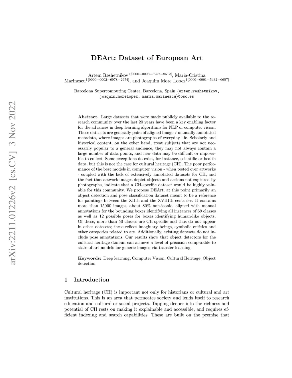 Large datasets that were made publicly available to the research community over the last 20 years have been a key enabling factor for the advances in deep learning algorithms for NLP or computer vision. These datasets are generally pairs of aligned image / manually annotated metadata, where images are photographs of everyday life. Scholarly and historical content, on the other hand, treat subjects that are not necessarily popular to a general audience, they may not always contain a large number of data points, and new data may be difficult or impossible to collect. Some exceptions do exist, for instance, scientific or health data, but this is not the case for cultural heritage (CH). The poor performance of the best models in computer vision - when tested over artworks - coupled with the lack of extensively annotated datasets for CH, and the fact that artwork images depict objects and actions not captured by photographs, indicate that a CH-specific dataset would be highly valuable for this community. We propose DEArt, at this point primarily an object detection and pose classification dataset meant to be a reference for paintings between the XIIth and the XVIIIth centuries. It contains more than 15000 images, about 80% non-iconic, aligned with manual annotations for the bounding boxes identifying all instances of 69 classes as well as 12 possible poses for boxes identifying human-like objects. Of these, more than 50 classes are CH-specific and thus do not appear in other datasets; these reflect imaginary beings, symbolic entities and other categories related to art. Additionally, existing datasets do not include pose annotations. Our results show that object detectors for the cultural heritage domain can achieve a level of precision comparable to state-of-art models for generic images via transfer learning.