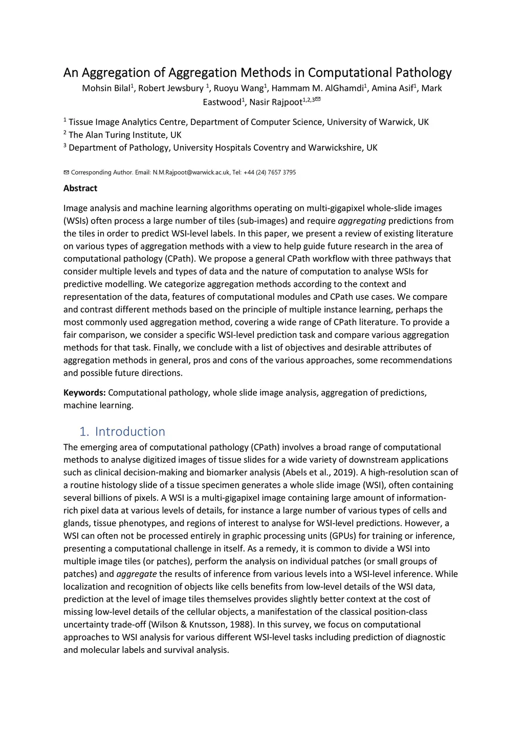 Image analysis and machine learning algorithms operating on multi-gigapixel whole-slide images (WSIs) often process a large number of tiles (sub-images) and require aggregating predictions from the tiles in order to predict WSI-level labels. In this paper, we present a review of existing literature on various types of aggregation methods with a view to help guide future research in the area of computational pathology (CPath). We propose a general CPath workflow with three pathways that consider multiple levels and types of data and the nature of computation to analyse WSIs for predictive modelling. We categorize aggregation methods according to the context and representation of the data, features of computational modules and CPath use cases. We compare and contrast different methods based on the principle of multiple instance learning, perhaps the most commonly used aggregation method, covering a wide range of CPath literature. To provide a fair comparison, we consider a specific WSI-level prediction task and compare various aggregation methods for that task. Finally, we conclude with a list of objectives and desirable attributes of aggregation methods in general, pros and cons of the various approaches, some recommendations and possible future directions.