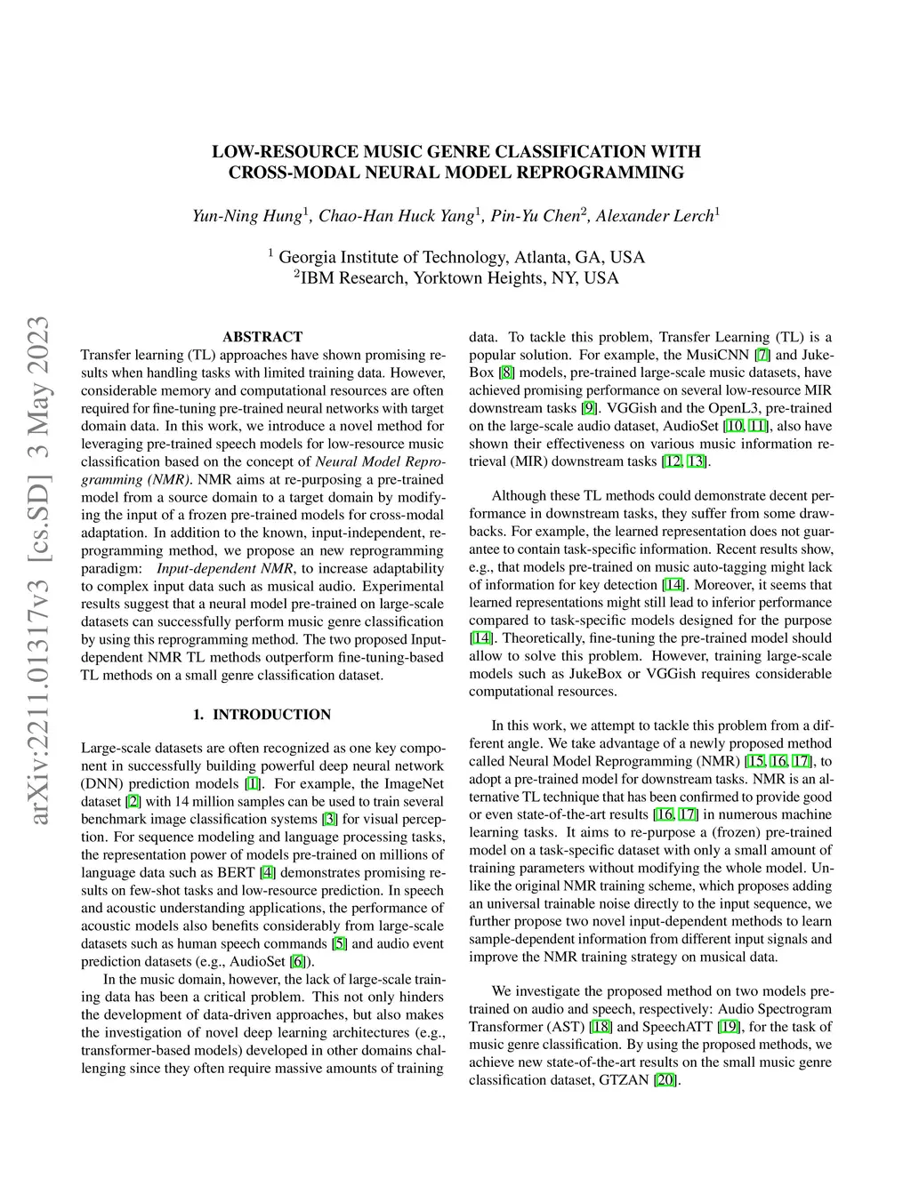 Transfer learning (TL) approaches have shown promising results when handling tasks with limited training data. However, considerable memory and computational resources are often required for fine-tuning pre-trained neural networks with target domain data. In this work, we introduce a novel method for leveraging pre-trained models for low-resource (music) classification based on the concept of Neural Model Reprogramming (NMR). NMR aims at re-purposing a pre-trained model from a source domain to a target domain by modifying the input of a frozen pre-trained model. In addition to the known, input-independent, reprogramming method, we propose an advanced reprogramming paradigm: Input-dependent NMR, to increase adaptability to complex input data such as musical audio. Experimental results suggest that a neural model pre-trained on large-scale datasets can successfully perform music genre classification by using this reprogramming method. The two proposed Input-dependent NMR TL methods outperform fine-tuning-based TL methods on a small genre classification dataset.