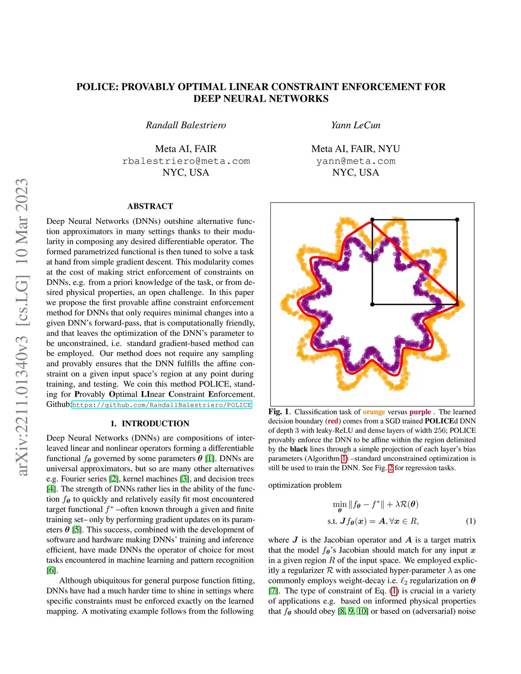 Deep Neural Networks (DNNs) outshine alternative function approximators in many settings thanks to their modularity in composing any desired differentiable operator. The formed parametrized functional is then tuned to solve a task at hand from simple gradient descent. This modularity comes at the cost of making strict enforcement of constraints on DNNs, e.g. from a priori knowledge of the task, or from desired physical properties, an open challenge. In this paper we propose the first provable affine constraint enforcement method for DNNs that requires minimal changes into a given DNN's forward-pass, that is computationally friendly, and that leaves the optimization of the DNN's parameter to be unconstrained i.e. standard gradient-based method can be employed. Our method does not require any sampling and provably ensures that the DNN fulfills the affine constraint on a given input space's region at any point during training, and testing. We coin this method POLICE, standing for Provably Optimal LInear Constraint Enforcement.