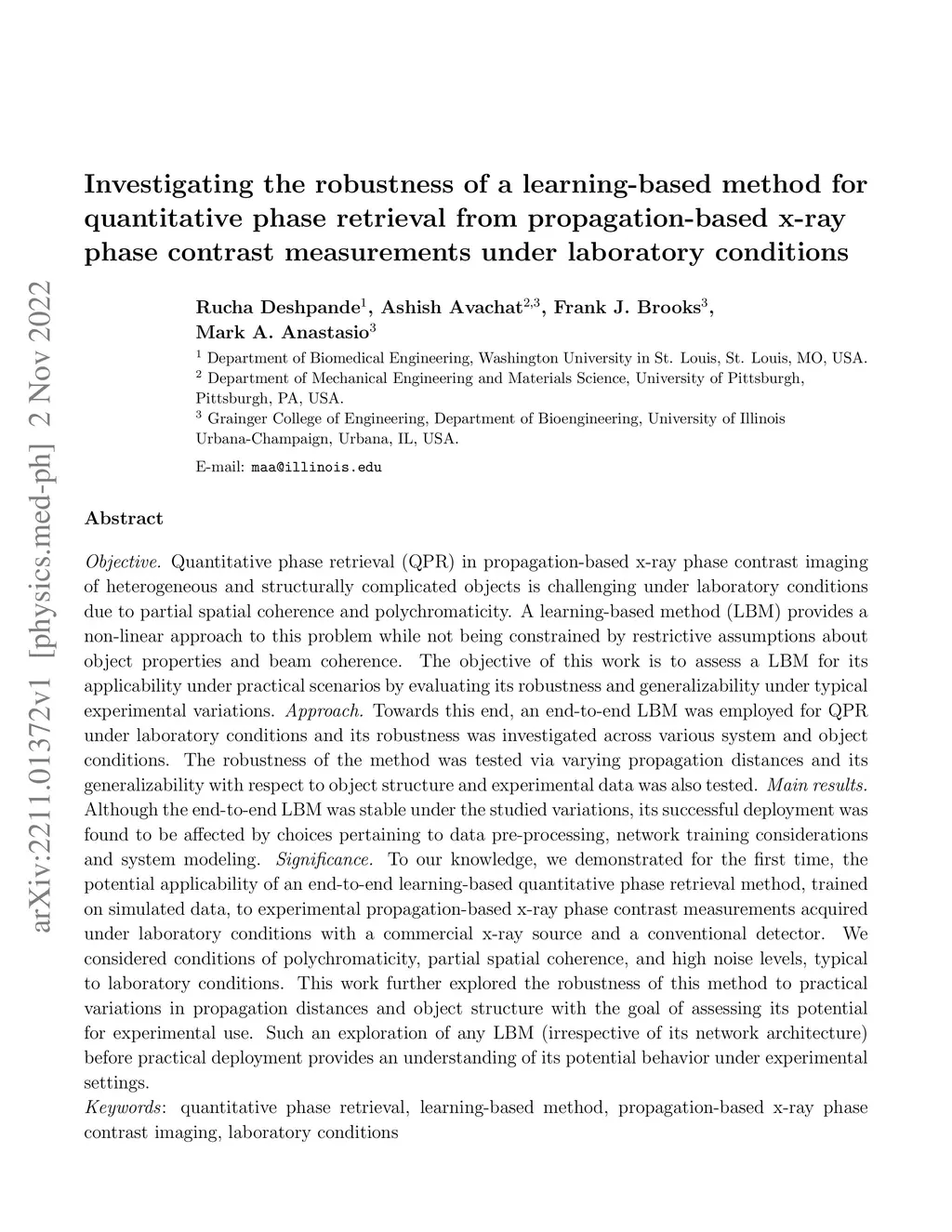 Quantitative phase retrieval (QPR) in propagation-based x-ray phase contrast imaging of heterogeneous and structurally complicated objects is challenging under laboratory conditions due to partial spatial coherence and polychromaticity. A learning-based method (LBM) provides a non-linear approach to this problem while not being constrained by restrictive assumptions about object properties and beam coherence. In this work, a LBM was assessed for its applicability under practical scenarios by evaluating its robustness and generalizability under typical experimental variations. Towards this end, an end-to-end LBM was employed for QPR under laboratory conditions and its robustness was investigated across various system and object conditions. The robustness of the method was tested via varying propagation distances and its generalizability with respect to object structure and experimental data was also tested. Although the LBM was stable under the studied variations, its successful deployment was found to be affected by choices pertaining to data pre-processing, network training considerations and system modeling. To our knowledge, we demonstrated for the first time, the potential applicability of an end-to-end learning-based quantitative phase retrieval method, trained on simulated data, to experimental propagation-based x-ray phase contrast measurements acquired under laboratory conditions. We considered conditions of polychromaticity, partial spatial coherence, and high noise levels, typical to laboratory conditions. This work further explored the robustness of this method to practical variations in propagation distances and object structure with the goal of assessing its potential for experimental use. Such an exploration of any LBM (irrespective of its network architecture) before practical deployment provides an understanding of its potential behavior under experimental settings.