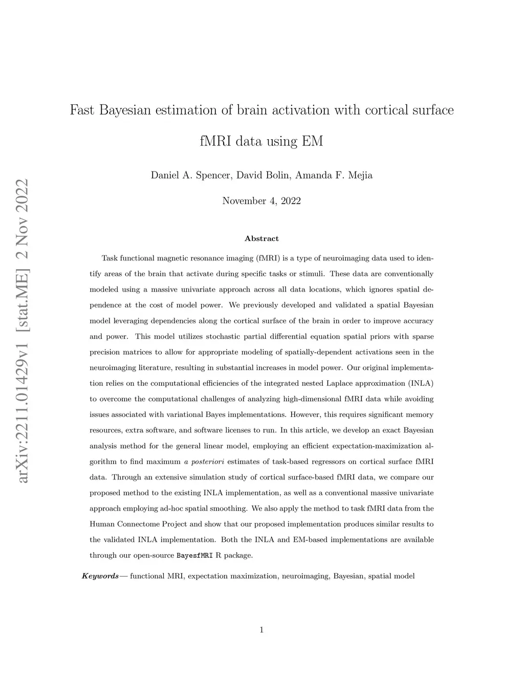 Task functional magnetic resonance imaging (fMRI) is a type of neuroimaging data used to identify areas of the brain that activate during specific tasks or stimuli. These data are conventionally modeled using a massive univariate approach across all data locations, which ignores spatial dependence at the cost of model power. We previously developed and validated a spatial Bayesian model leveraging dependencies along the cortical surface of the brain in order to improve accuracy and power. This model utilizes stochastic partial differential equation spatial priors with sparse precision matrices to allow for appropriate modeling of spatially-dependent activations seen in the neuroimaging literature, resulting in substantial increases in model power. Our original implementation relies on the computational efficiencies of the integrated nested Laplace approximation (INLA) to overcome the computational challenges of analyzing high-dimensional fMRI data while avoiding issues associated with variational Bayes implementations. However, this requires significant memory resources, extra software, and software licenses to run. In this article, we develop an exact Bayesian analysis method for the general linear model, employing an efficient expectation-maximization algorithm to find maximum a posteriori estimates of task-based regressors on cortical surface fMRI data. Through an extensive simulation study of cortical surface-based fMRI data, we compare our proposed method to the existing INLA implementation, as well as a conventional massive univariate approach employing ad-hoc spatial smoothing. We also apply the method to task fMRI data from the Human Connectome Project and show that our proposed implementation produces similar results to the validated INLA implementation. Both the INLA and EM-based implementations are available through our open-source BayesfMRI R package.