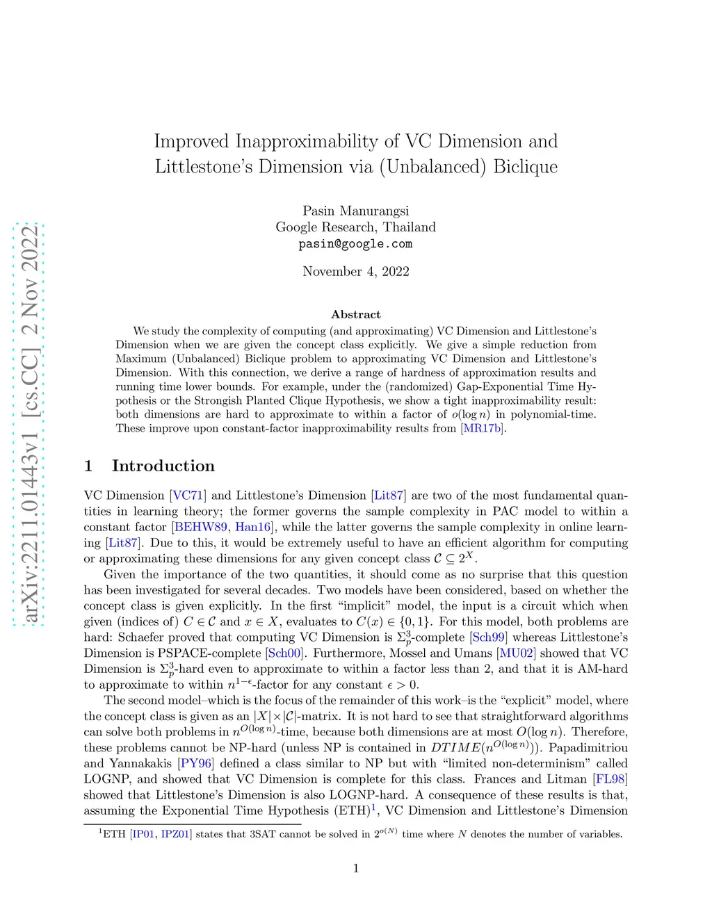 We study the complexity of computing (and approximating) VC Dimension and Littlestone's Dimension when we are given the concept class explicitly. We give a simple reduction from Maximum (Unbalanced) Biclique problem to approximating VC Dimension and Littlestone's Dimension. With this connection, we derive a range of hardness of approximation results and running time lower bounds. For example, under the (randomized) Gap-Exponential Time Hypothesis or the Strongish Planted Clique Hypothesis, we show a tight inapproximability result: both dimensions are hard to approximate to within a factor of in polynomial-time. These improve upon constant-factor inapproximability results from [Manurangsi and Rubinstein, COLT 2017].