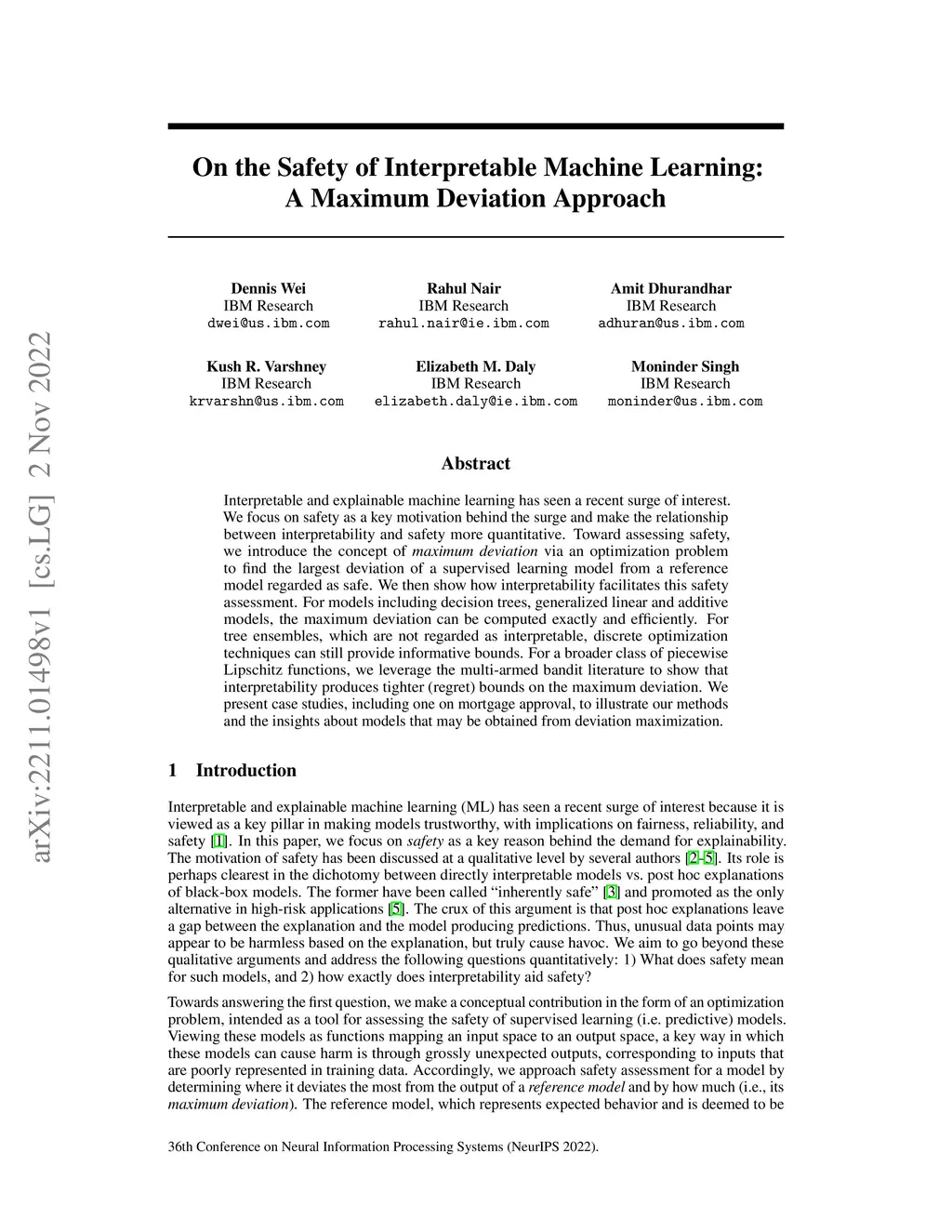 Interpretable and explainable machine learning has seen a recent surge of interest. We focus on safety as a key motivation behind the surge and make the relationship between interpretability and safety more quantitative. Toward assessing safety, we introduce the concept of maximum deviation via an optimization problem to find the largest deviation of a supervised learning model from a reference model regarded as safe. We then show how interpretability facilitates this safety assessment. For models including decision trees, generalized linear and additive models, the maximum deviation can be computed exactly and efficiently. For tree ensembles, which are not regarded as interpretable, discrete optimization techniques can still provide informative bounds. For a broader class of piecewise Lipschitz functions, we leverage the multi-armed bandit literature to show that interpretability produces tighter (regret) bounds on the maximum deviation. We present case studies, including one on mortgage approval, to illustrate our methods and the insights about models that may be obtained from deviation maximization.