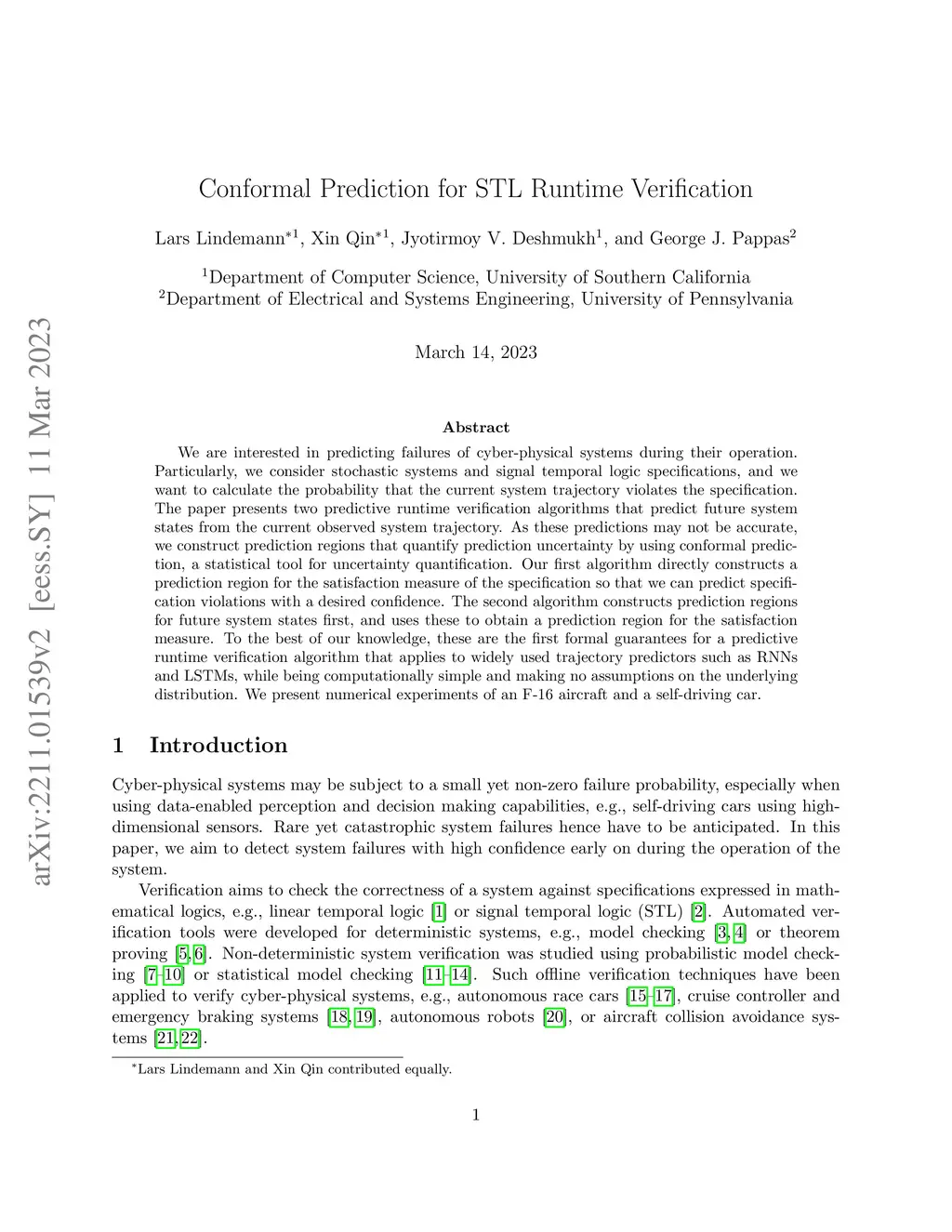 We are interested in predicting failures of cyber-physical systems during their operation. Particularly, we consider stochastic systems and signal temporal logic specifications, and we want to calculate the probability that the current system trajectory violates the specification. The paper presents two predictive runtime verification algorithms that predict future system states from the current observed system trajectory. As these predictions may not be accurate, we construct prediction regions that quantify prediction uncertainty by using conformal prediction, a statistical tool for uncertainty quantification. Our first algorithm directly constructs a prediction region for the satisfaction measure of the specification so that we can predict specification violations with a desired confidence. The second algorithm constructs prediction regions for future system states first, and uses these to obtain a prediction region for the satisfaction measure. To the best of our knowledge, these are the first formal guarantees for a predictive runtime verification algorithm that applies to widely used trajectory predictors such as RNNs and LSTMs, while being computationally simple and making no assumptions on the underlying distribution. We present numerical experiments of an F-16 aircraft and a self-driving car.
