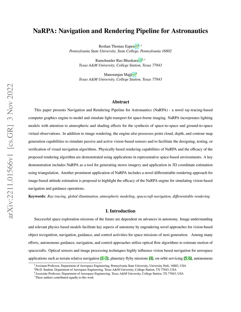 This paper presents Navigation and Rendering Pipeline for Astronautics (NaRPA) - a novel ray-tracing-based computer graphics engine to model and simulate light transport for space-borne imaging. NaRPA incorporates lighting models with attention to atmospheric and shading effects for the synthesis of space-to-space and ground-to-space virtual observations. In addition to image rendering, the engine also possesses point cloud, depth, and contour map generation capabilities to simulate passive and active vision-based sensors and to facilitate the designing, testing, or verification of visual navigation algorithms. Physically based rendering capabilities of NaRPA and the efficacy of the proposed rendering algorithm are demonstrated using applications in representative space-based environments. A key demonstration includes NaRPA as a tool for generating stereo imagery and application in 3D coordinate estimation using triangulation. Another prominent application of NaRPA includes a novel differentiable rendering approach for image-based attitude estimation is proposed to highlight the efficacy of the NaRPA engine for simulating vision-based navigation and guidance operations.