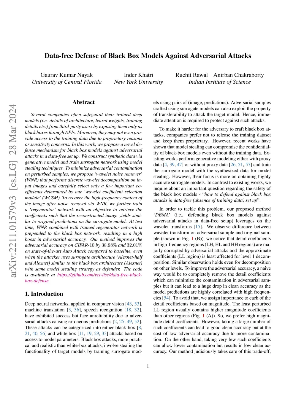 Several companies often safeguard their trained deep models (i.e., details of architecture, learnt weights, training details etc.) from third-party users by exposing them only as black boxes through APIs. Moreover, they may not even provide access to the training data due to proprietary reasons or sensitivity concerns. In this work, we propose a novel defense mechanism for black box models against adversarial attacks in a data-free set up. We construct synthetic data via generative model and train surrogate network using model stealing techniques. To minimize adversarial contamination on perturbed samples, we propose 'wavelet noise remover' (WNR) that performs discrete wavelet decomposition on input images and carefully select only a few important coefficients determined by our 'wavelet coefficient selection module' (WCSM). To recover the high-frequency content of the image after noise removal via WNR, we further train a 'regenerator' network with an objective to retrieve the coefficients such that the reconstructed image yields similar to original predictions on the surrogate model. At test time, WNR combined with trained regenerator network is prepended to the black box network, resulting in a high boost in adversarial accuracy. Our method improves the adversarial accuracy on CIFAR-10 by 38.98% and 32.01% on state-of-the-art Auto Attack compared to baseline, even when the attacker uses surrogate architecture (Alexnet-half and Alexnet) similar to the black box architecture (Alexnet) with same model stealing strategy as defender. The code is available at https://github.com/vcl-iisc/data-free-black-box-defense