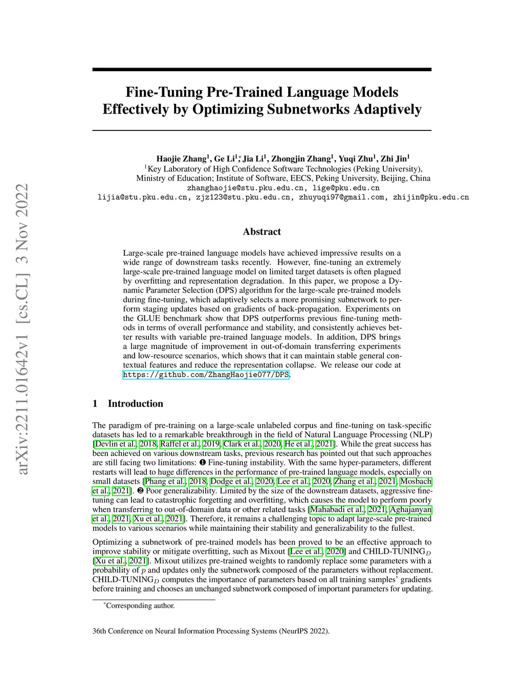 Large-scale pre-trained language models have achieved impressive results on a wide range of downstream tasks recently. However, fine-tuning an extremely large-scale pre-trained language model on limited target datasets is often plagued by overfitting and representation degradation. In this paper, we propose a Dynamic Parameter Selection (DPS) algorithm for the large-scale pre-trained models during fine-tuning, which adaptively selects a more promising subnetwork to perform staging updates based on gradients of back-propagation. Experiments on the GLUE benchmark show that DPS outperforms previous fine-tuning methods in terms of overall performance and stability, and consistently achieves better results with variable pre-trained language models. In addition, DPS brings a large magnitude of improvement in out-of-domain transferring experiments and low-resource scenarios, which shows that it can maintain stable general contextual features and reduce the representation collapse. We release our code at https://github.com/ZhangHaojie077/DPS