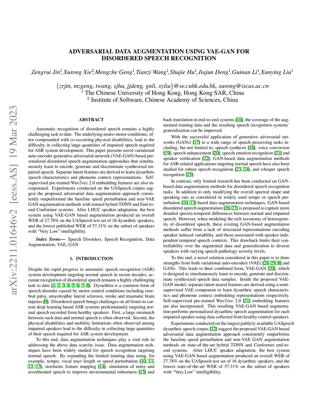 Adversarial Data Augmentation Using VAE-GAN for Disordered Speech Recognition