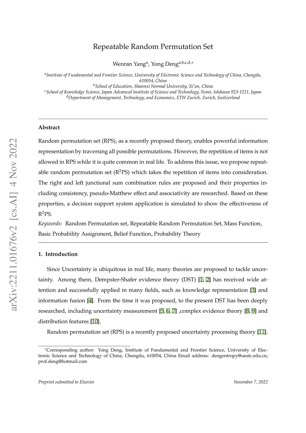 Based on Dempster-Shafer evidence theory (DST), random permutation set (RPS) is proposed by replacing combinatorial number with permutation number and therefore incorporating order information. Besides, RPS could take DST as a special case when all items occur in the same order. However, the repetition of items is not allowed in RPS. To address this issue, we propose repeatable random permutation set (R2PS) which takes the repetition of items into consideration. The right and left junctional sum combination rules are proposed and their properties including consistency, pseudo-Matthew effect and associativity are researched. Based on these properties, a decision support system application is simulated to show the effectiveness of R2PS.