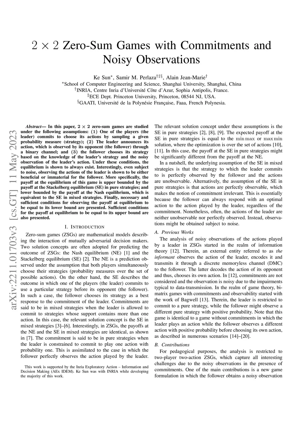 In this paper, zero-sum games are studied under the following assumptions: One of the players (the leader) commits to choose its actions by sampling a given probability measure (strategy); The leader announces its action, which is observed by its opponent (the follower) through a binary channel; and the follower chooses its strategy based on the knowledge of the leader's strategy and the noisy observation of the leader's action. Under these conditions, the equilibrium is shown to always exist. Interestingly, even subject to noise, observing the actions of the leader is shown to be either beneficial or immaterial for the follower. More specifically, the payoff at the equilibrium of this game is upper bounded by the payoff at the Stackelberg equilibrium (SE) in pure strategies; and lower bounded by the payoff at the Nash equilibrium, which is equivalent to the SE in mixed strategies.Finally, necessary and sufficient conditions for observing the payoff at equilibrium to be equal to its lower bound are presented. Sufficient conditions for the payoff at equilibrium to be equal to its upper bound are also presented.