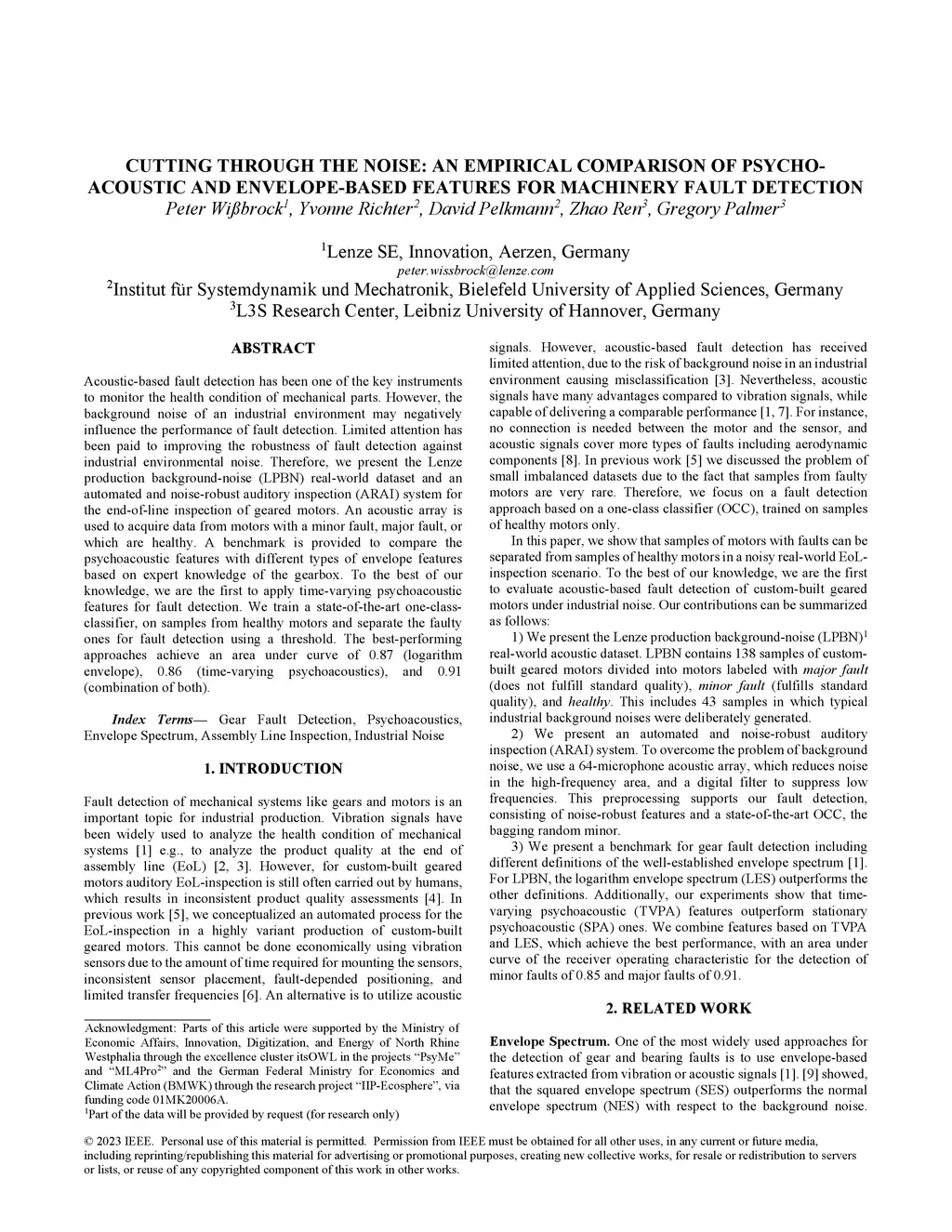 Acoustic-based fault detection has a high potential to monitor the health condition of mechanical parts. However, the background noise of an industrial environment may negatively influence the performance of fault detection. Limited attention has been paid to improving the robustness of fault detection against industrial environmental noise. Therefore, we present the Lenze production background-noise (LPBN) real-world dataset and an automated and noise-robust auditory inspection (ARAI) system for the end-of-line inspection of geared motors. An acoustic array is used to acquire data from motors with a minor fault, major fault, or which are healthy. A benchmark is provided to compare the psychoacoustic features with different types of envelope features based on expert knowledge of the gearbox. To the best of our knowledge, we are the first to apply time-varying psychoacoustic features for fault detection. We train a state-of-the-art one-class-classifier, on samples from healthy motors and separate the faulty ones for fault detection using a threshold. The best-performing approaches achieve an area under curve of 0.87 (logarithm envelope), 0.86 (time-varying psychoacoustics), and 0.91 (combination of both).