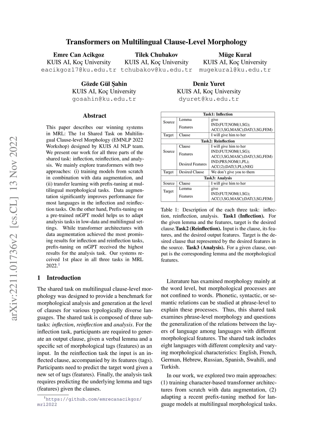 This paper describes our winning systems in MRL: The 1st Shared Task on Multilingual Clause-level Morphology (EMNLP 2022 Workshop) designed by KUIS AI NLP team. We present our work for all three parts of the shared task: inflection, reinflection, and analysis. We mainly explore transformers with two approaches: (i) training models from scratch in combination with data augmentation, and (ii) transfer learning with prefix-tuning at multilingual morphological tasks. Data augmentation significantly improves performance for most languages in the inflection and reinflection tasks. On the other hand, Prefix-tuning on a pre-trained mGPT model helps us to adapt analysis tasks in low-data and multilingual settings. While transformer architectures with data augmentation achieved the most promising results for inflection and reinflection tasks, prefix-tuning on mGPT received the highest results for the analysis task. Our systems received 1st place in all three tasks in MRL 2022.