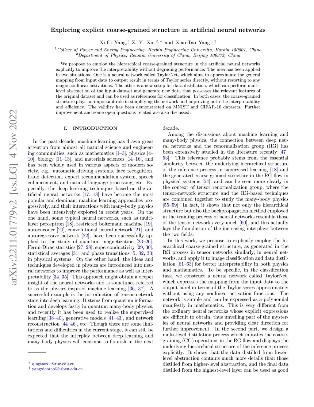 We propose to employ the hierarchical coarse-grained structure in the artificial neural networks explicitly to improve the interpretability without degrading performance. The idea has been applied in two situations. One is a neural network called TaylorNet, which aims to approximate the general mapping from input data to output result in terms of Taylor series directly, without resorting to any magic nonlinear activations. The other is a new setup for data distillation, which can perform multi-level abstraction of the input dataset and generate new data that possesses the relevant features of the original dataset and can be used as references for classification. In both cases, the coarse-grained structure plays an important role in simplifying the network and improving both the interpretability and efficiency. The validity has been demonstrated on MNIST and CIFAR-10 datasets. Further improvement and some open questions related are also discussed.