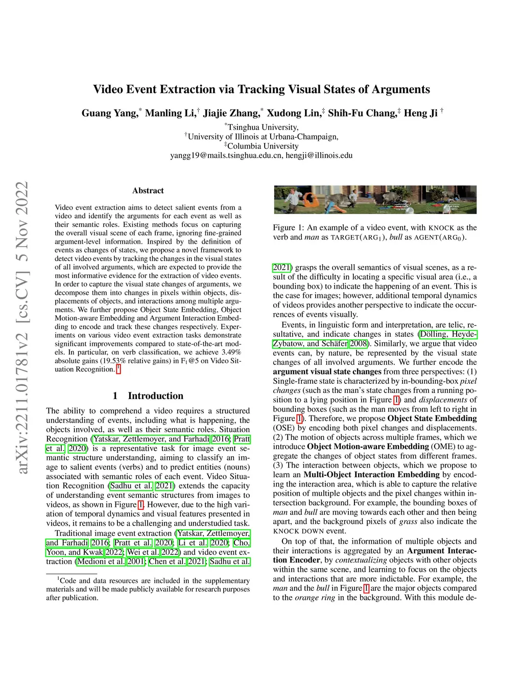Video event extraction aims to detect salient events from a video and identify the arguments for each event as well as their semantic roles. Existing methods focus on capturing the overall visual scene of each frame, ignoring fine-grained argument-level information. Inspired by the definition of events as changes of states, we propose a novel framework to detect video events by tracking the changes in the visual states of all involved arguments, which are expected to provide the most informative evidence for the extraction of video events. In order to capture the visual state changes of arguments, we decompose them into changes in pixels within objects, displacements of objects, and interactions among multiple arguments. We further propose Object State Embedding, Object Motion-aware Embedding and Argument Interaction Embedding to encode and track these changes respectively. Experiments on various video event extraction tasks demonstrate significant improvements compared to state-of-the-art models. In particular, on verb classification, we achieve 3.49% absolute gains (19.53% relative gains) in F1@5 on Video Situation Recognition.