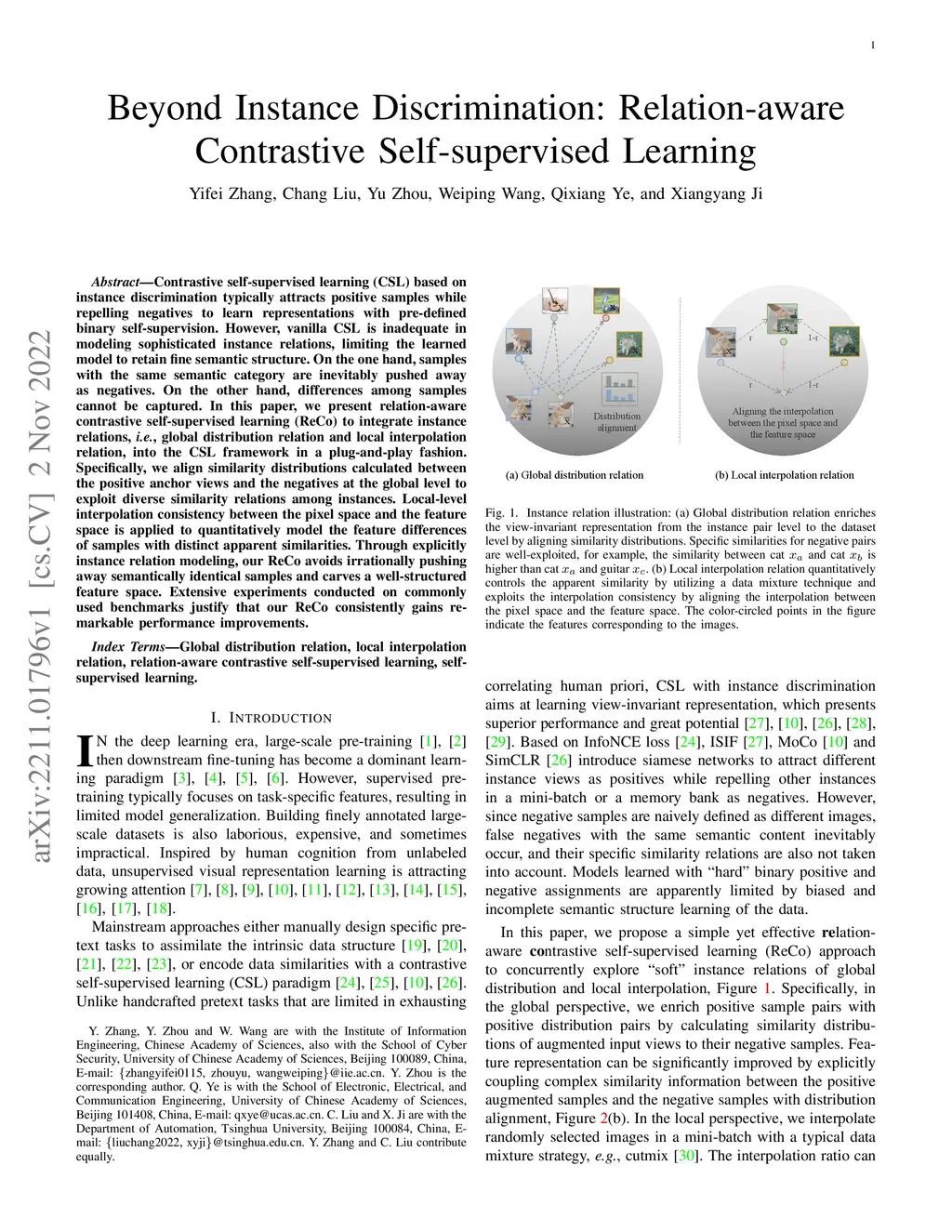 Contrastive self-supervised learning (CSL) based on instance discrimination typically attracts positive samples while repelling negatives to learn representations with pre-defined binary self-supervision. However, vanilla CSL is inadequate in modeling sophisticated instance relations, limiting the learned model to retain fine semantic structure. On the one hand, samples with the same semantic category are inevitably pushed away as negatives. On the other hand, differences among samples cannot be captured. In this paper, we present relation-aware contrastive self-supervised learning (ReCo) to integrate instance relations, i.e., global distribution relation and local interpolation relation, into the CSL framework in a plug-and-play fashion. Specifically, we align similarity distributions calculated between the positive anchor views and the negatives at the global level to exploit diverse similarity relations among instances. Local-level interpolation consistency between the pixel space and the feature space is applied to quantitatively model the feature differences of samples with distinct apparent similarities. Through explicitly instance relation modeling, our ReCo avoids irrationally pushing away semantically identical samples and carves a well-structured feature space. Extensive experiments conducted on commonly used benchmarks justify that our ReCo consistently gains remarkable performance improvements.