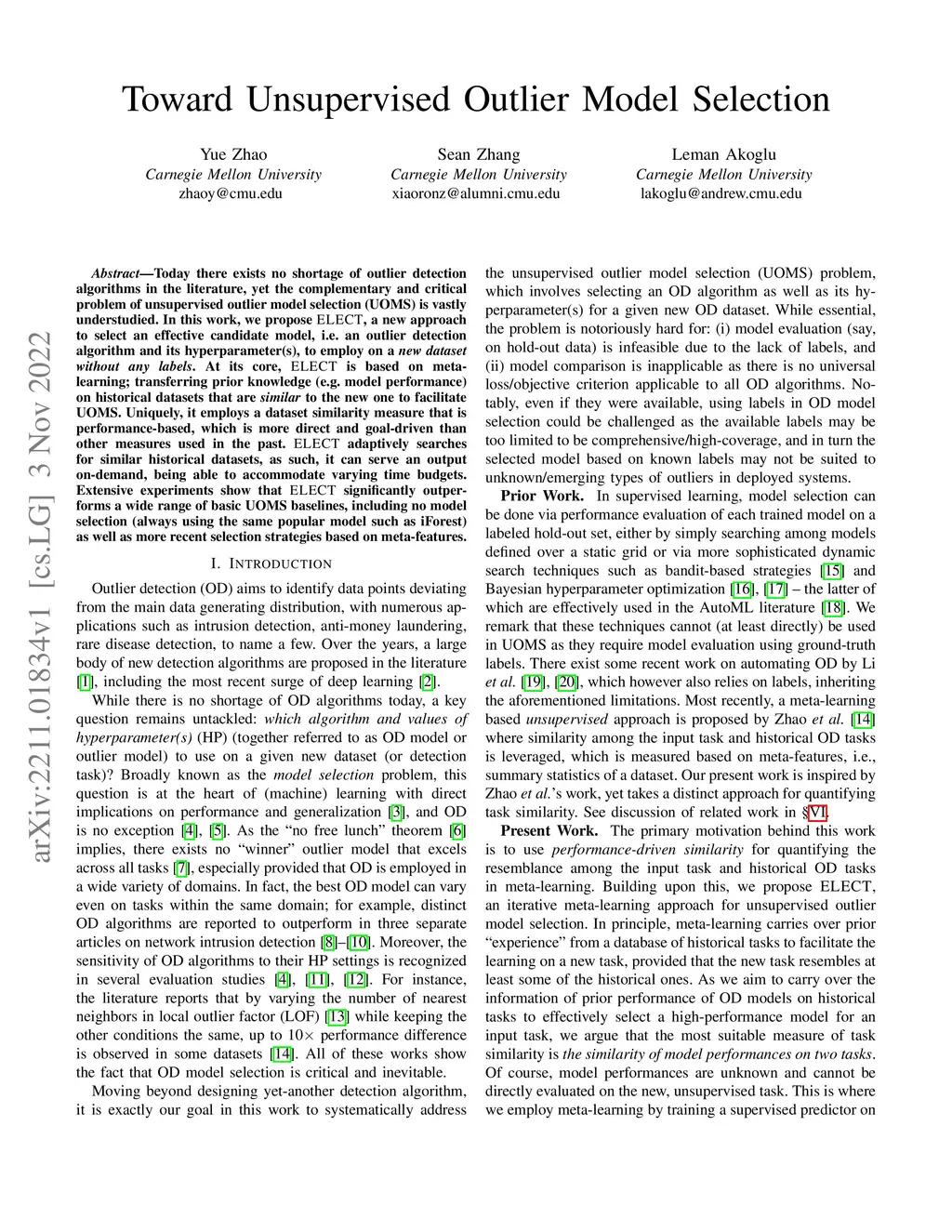 Today there exists no shortage of outlier detection algorithms in the literature, yet the complementary and critical problem of unsupervised outlier model selection (UOMS) is vastly understudied. In this work we propose ELECT, a new approach to select an effective candidate model, i.e. an outlier detection algorithm and its hyperparameter(s), to employ on a new dataset without any labels. At its core, ELECT is based on meta-learning; transferring prior knowledge (e.g. model performance) on historical datasets that are similar to the new one to facilitate UOMS. Uniquely, it employs a dataset similarity measure that is performance-based, which is more direct and goal-driven than other measures used in the past. ELECT adaptively searches for similar historical datasets, as such, it can serve an output on-demand, being able to accommodate varying time budgets. Extensive experiments show that ELECT significantly outperforms a wide range of basic UOMS baselines, including no model selection (always using the same popular model such as iForest) as well as more recent selection strategies based on meta-features.