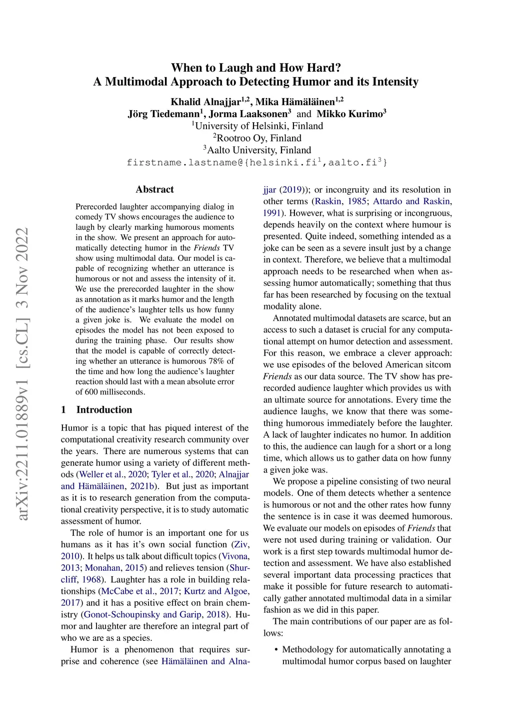 Prerecorded laughter accompanying dialog in comedy TV shows encourages the audience to laugh by clearly marking humorous moments in the show. We present an approach for automatically detecting humor in the Friends TV show using multimodal data. Our model is capable of recognizing whether an utterance is humorous or not and assess the intensity of it. We use the prerecorded laughter in the show as annotation as it marks humor and the length of the audience's laughter tells us how funny a given joke is. We evaluate the model on episodes the model has not been exposed to during the training phase. Our results show that the model is capable of correctly detecting whether an utterance is humorous 78% of the time and how long the audience's laughter reaction should last with a mean absolute error of 600 milliseconds.