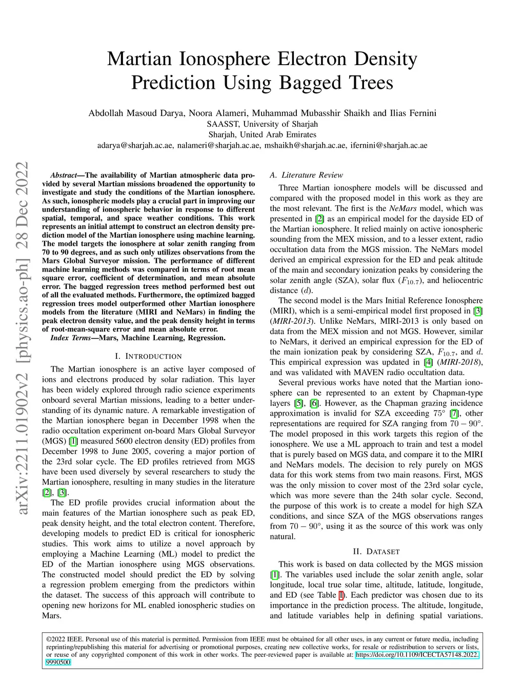 Martian Ionosphere Electron Density Prediction Using Bagged Trees