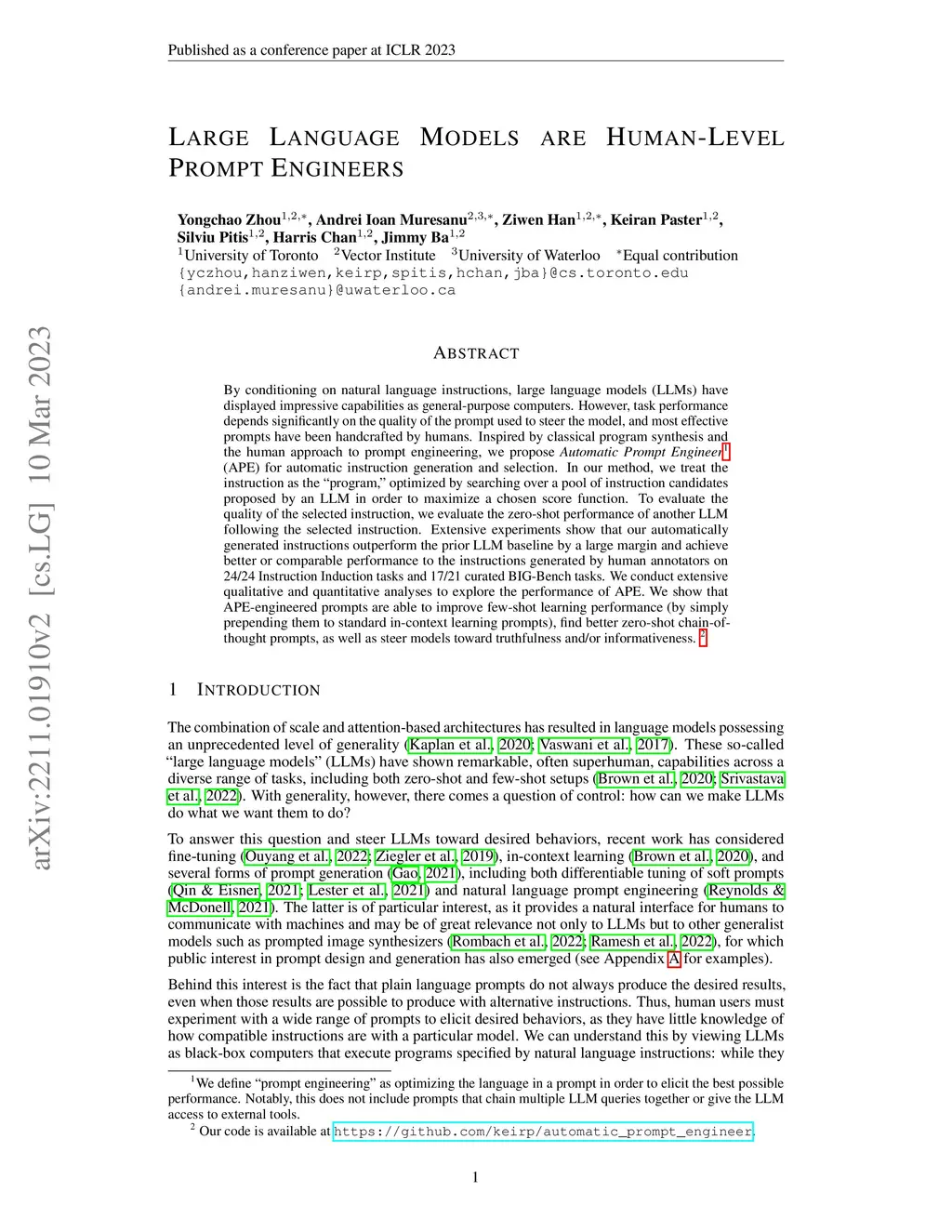 By conditioning on natural language instructions, large language models (LLMs) have displayed impressive capabilities as general-purpose computers. However, task performance depends significantly on the quality of the prompt used to steer the model, and most effective prompts have been handcrafted by humans. Inspired by classical program synthesis and the human approach to prompt engineering, we propose Automatic Prompt Engineer (APE) for automatic instruction generation and selection. In our method, we treat the instruction as the "program," optimized by searching over a pool of instruction candidates proposed by an LLM in order to maximize a chosen score function. To evaluate the quality of the selected instruction, we evaluate the zero-shot performance of another LLM following the selected instruction. Experiments on 24 NLP tasks show that our automatically generated instructions outperform the prior LLM baseline by a large margin and achieve better or comparable performance to the instructions generated by human annotators on 19/24 tasks. We conduct extensive qualitative and quantitative analyses to explore the performance of APE. We show that APE-engineered prompts can be applied to steer models toward truthfulness and/or informativeness, as well as to improve few-shot learning performance by simply prepending them to standard in-context learning prompts. Please check out our webpage at https://sites.google.com/view/automatic-prompt-engineer.
