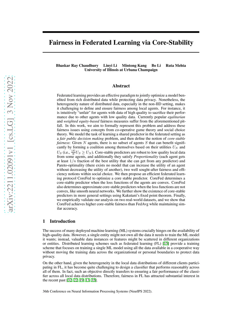 Federated learning provides an effective paradigm to jointly optimize a model benefited from rich distributed data while protecting data privacy. Nonetheless, the heterogeneity nature of distributed data makes it challenging to define and ensure fairness among local agents. For instance, it is intuitively "unfair" for agents with data of high quality to sacrifice their performance due to other agents with low quality data. Currently popular egalitarian and weighted equity-based fairness measures suffer from the aforementioned pitfall. In this work, we aim to formally represent this problem and address these fairness issues using concepts from co-operative game theory and social choice theory. We model the task of learning a shared predictor in the federated setting as a fair public decision making problem, and then define the notion of core-stable fairness: Given agents, there is no subset of agents that can benefit significantly by forming a coalition among themselves based on their utilities and (i.e., ). Core-stable predictors are robust to low quality local data from some agents, and additionally they satisfy Proportionality and Pareto-optimality, two well sought-after fairness and efficiency notions within social choice. We then propose an efficient federated learning protocol CoreFed to optimize a core stable predictor. CoreFed determines a core-stable predictor when the loss functions of the agents are convex. CoreFed also determines approximate core-stable predictors when the loss functions are not convex, like smooth neural networks. We further show the existence of core-stable predictors in more general settings using Kakutani's fixed point theorem. Finally, we empirically validate our analysis on two real-world datasets, and we show that CoreFed achieves higher core-stability fairness than FedAvg while having similar accuracy.