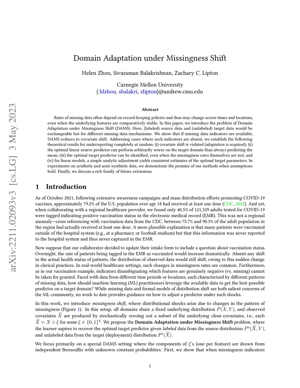 Rates of missing data often depend on record-keeping policies and thus may change across times and locations, even when the underlying features are comparatively stable. In this paper, we introduce the problem of Domain Adaptation under Missingness Shift (DAMS). Here, (labeled) source data and (unlabeled) target data would be exchangeable but for different missing data mechanisms. We show that if missing data indicators are available, DAMS reduces to covariate shift. Addressing cases where such indicators are absent, we establish the following theoretical results for underreporting completely at random: (i) covariate shift is violated (adaptation is required); (ii) the optimal linear source predictor can perform arbitrarily worse on the target domain than always predicting the mean; (iii) the optimal target predictor can be identified, even when the missingness rates themselves are not; and (iv) for linear models, a simple analytic adjustment yields consistent estimates of the optimal target parameters. In experiments on synthetic and semi-synthetic data, we demonstrate the promise of our methods when assumptions hold. Finally, we discuss a rich family of future extensions.
