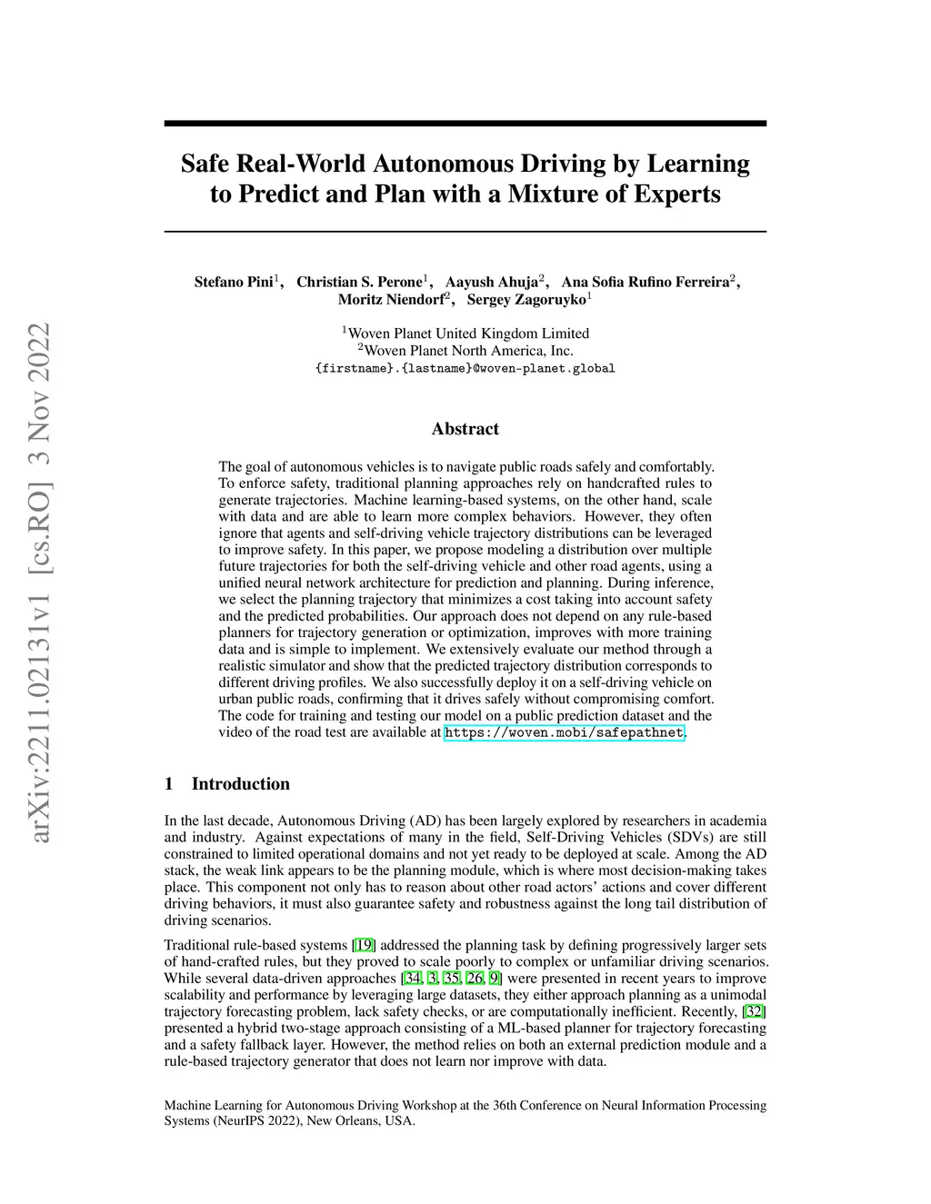 The goal of autonomous vehicles is to navigate public roads safely and comfortably. To enforce safety, traditional planning approaches rely on handcrafted rules to generate trajectories. Machine learning-based systems, on the other hand, scale with data and are able to learn more complex behaviors. However, they often ignore that agents and self-driving vehicle trajectory distributions can be leveraged to improve safety. In this paper, we propose modeling a distribution over multiple future trajectories for both the self-driving vehicle and other road agents, using a unified neural network architecture for prediction and planning. During inference, we select the planning trajectory that minimizes a cost taking into account safety and the predicted probabilities. Our approach does not depend on any rule-based planners for trajectory generation or optimization, improves with more training data and is simple to implement. We extensively evaluate our method through a realistic simulator and show that the predicted trajectory distribution corresponds to different driving profiles. We also successfully deploy it on a self-driving vehicle on urban public roads, confirming that it drives safely without compromising comfort. The code for training and testing our model on a public prediction dataset and the video of the road test are available at https://woven.mobi/safepathnet