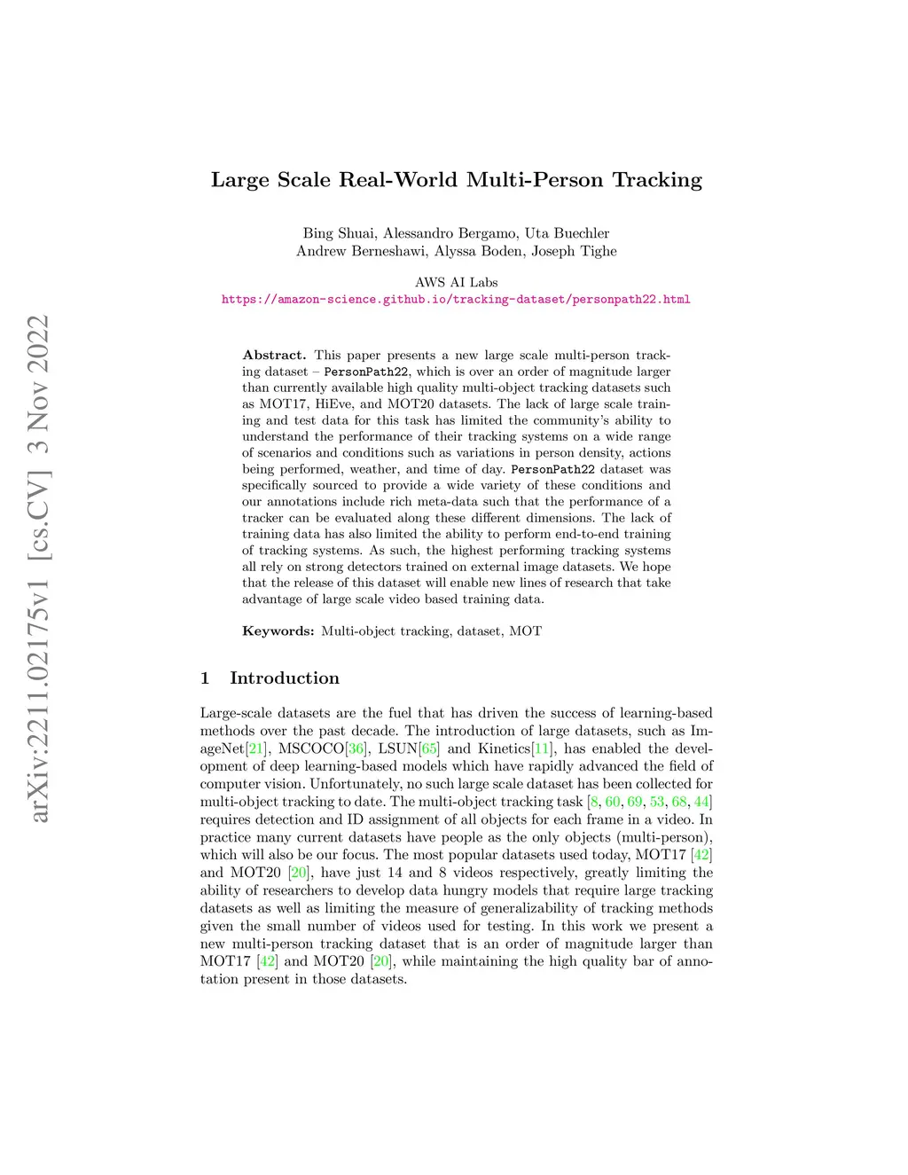 This paper presents a new large scale multi-person tracking dataset -- \texttt{PersonPath22}, which is over an order of magnitude larger than currently available high quality multi-object tracking datasets such as MOT17, HiEve, and MOT20 datasets. The lack of large scale training and test data for this task has limited the community's ability to understand the performance of their tracking systems on a wide range of scenarios and conditions such as variations in person density, actions being performed, weather, and time of day. \texttt{PersonPath22} dataset was specifically sourced to provide a wide variety of these conditions and our annotations include rich meta-data such that the performance of a tracker can be evaluated along these different dimensions. The lack of training data has also limited the ability to perform end-to-end training of tracking systems. As such, the highest performing tracking systems all rely on strong detectors trained on external image datasets. We hope that the release of this dataset will enable new lines of research that take advantage of large scale video based training data.