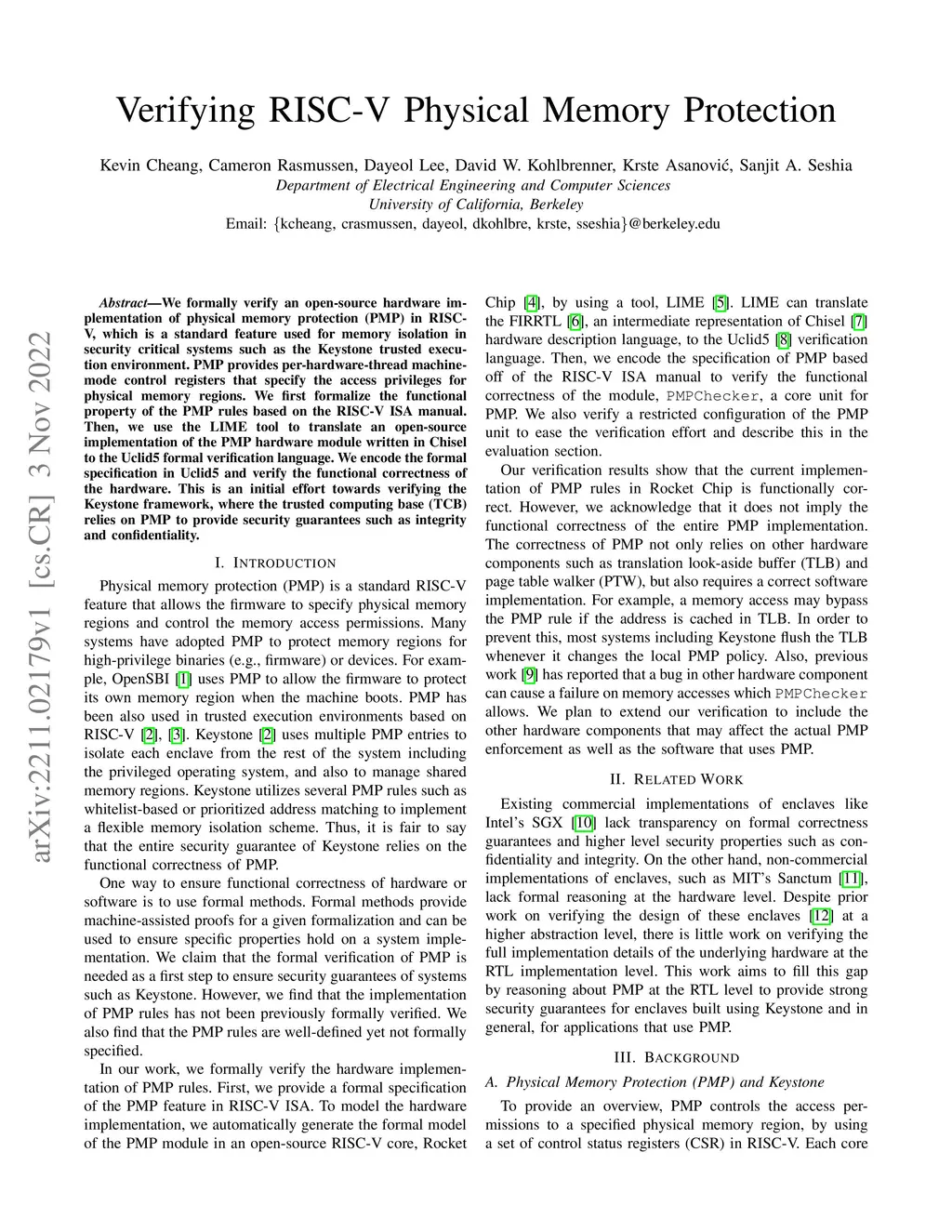 We formally verify an open-source hardware implementation of physical memory protection (PMP) in RISC-V, which is a standard feature used for memory isolation in security critical systems such as the Keystone trusted execution environment. PMP provides per-hardware-thread machine-mode control registers that specify the access privileges for physical memory regions. We first formalize the functional property of the PMP rules based on the RISC-V ISA manual. Then, we use the LIME tool to translate an open-source implementation of the PMP hardware module written in Chisel to the UCLID5 formal verification language. We encode the formal specification in UCLID5 and verify the functional correctness of the hardware. This is an initial effort towards verifying the Keystone framework, where the trusted computing base (TCB) relies on PMP to provide security guarantees such as integrity and confidentiality.