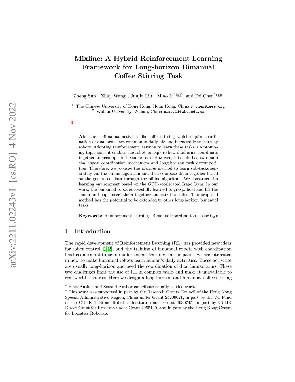 Bimanual activities like coffee stirring, which require coordination of dual arms, are common in daily life and intractable to learn by robots. Adopting reinforcement learning to learn these tasks is a promising topic since it enables the robot to explore how dual arms coordinate together to accomplish the same task. However, this field has two main challenges: coordination mechanism and long-horizon task decomposition. Therefore, we propose the Mixline method to learn sub-tasks separately via the online algorithm and then compose them together based on the generated data through the offline algorithm. We constructed a learning environment based on the GPU-accelerated Isaac Gym. In our work, the bimanual robot successfully learned to grasp, hold and lift the spoon and cup, insert them together and stir the coffee. The proposed method has the potential to be extended to other long-horizon bimanual tasks.