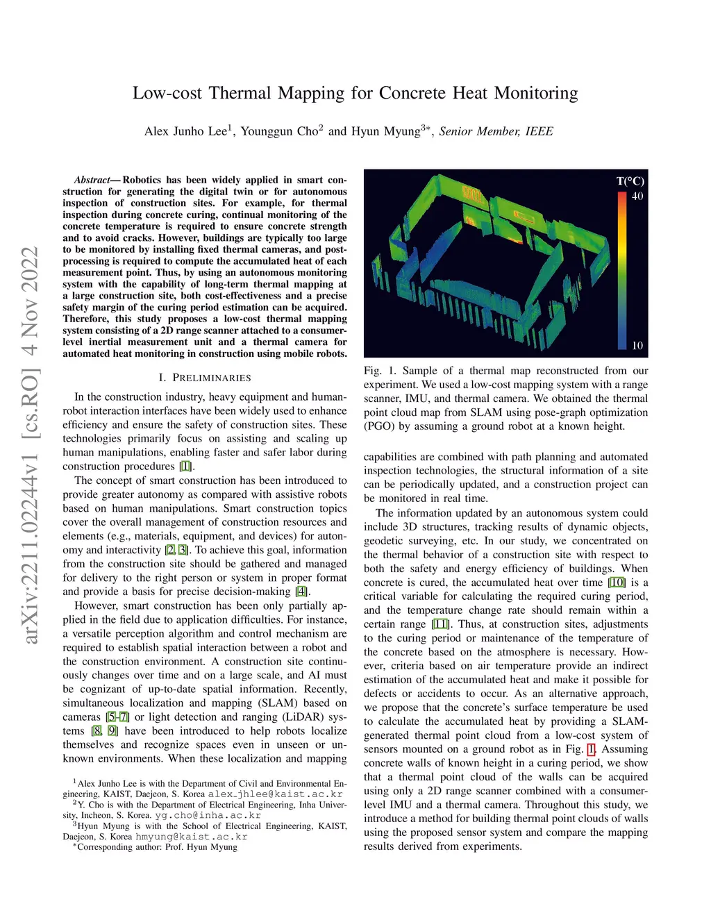 Robotics has been widely applied in smart construction for generating the digital twin or for autonomous inspection of construction sites. For example, for thermal inspection during concrete curing, continual monitoring of the concrete temperature is required to ensure concrete strength and to avoid cracks. However, buildings are typically too large to be monitored by installing fixed thermal cameras, and post-processing is required to compute the accumulated heat of each measurement point. Thus, by using an autonomous monitoring system with the capability of long-term thermal mapping at a large construction site, both cost-effectiveness and a precise safety margin of the curing period estimation can be acquired. Therefore, this study proposes a low-cost thermal mapping system consisting of a 2D range scanner attached to a consumer-level inertial measurement unit and a thermal camera for automated heat monitoring in construction using mobile robots.
