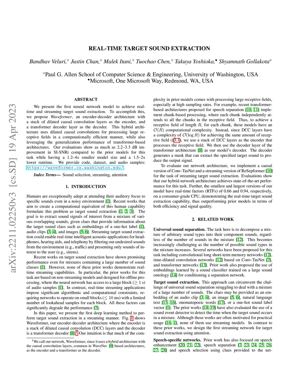 We present the first neural network model to achieve real-time and streaming target sound extraction. To accomplish this, we propose Waveformer, an encoder-decoder architecture with a stack of dilated causal convolution layers as the encoder, and a transformer decoder layer as the decoder. This hybrid architecture uses dilated causal convolutions for processing large receptive fields in a computationally efficient manner while also leveraging the generalization performance of transformer-based architectures. Our evaluations show as much as 2.2-3.3 dB improvement in SI-SNRi compared to the prior models for this task while having a 1.2-4x smaller model size and a 1.5-2x lower runtime. We provide code, dataset, and audio samples: https://waveformer.cs.washington.edu/.