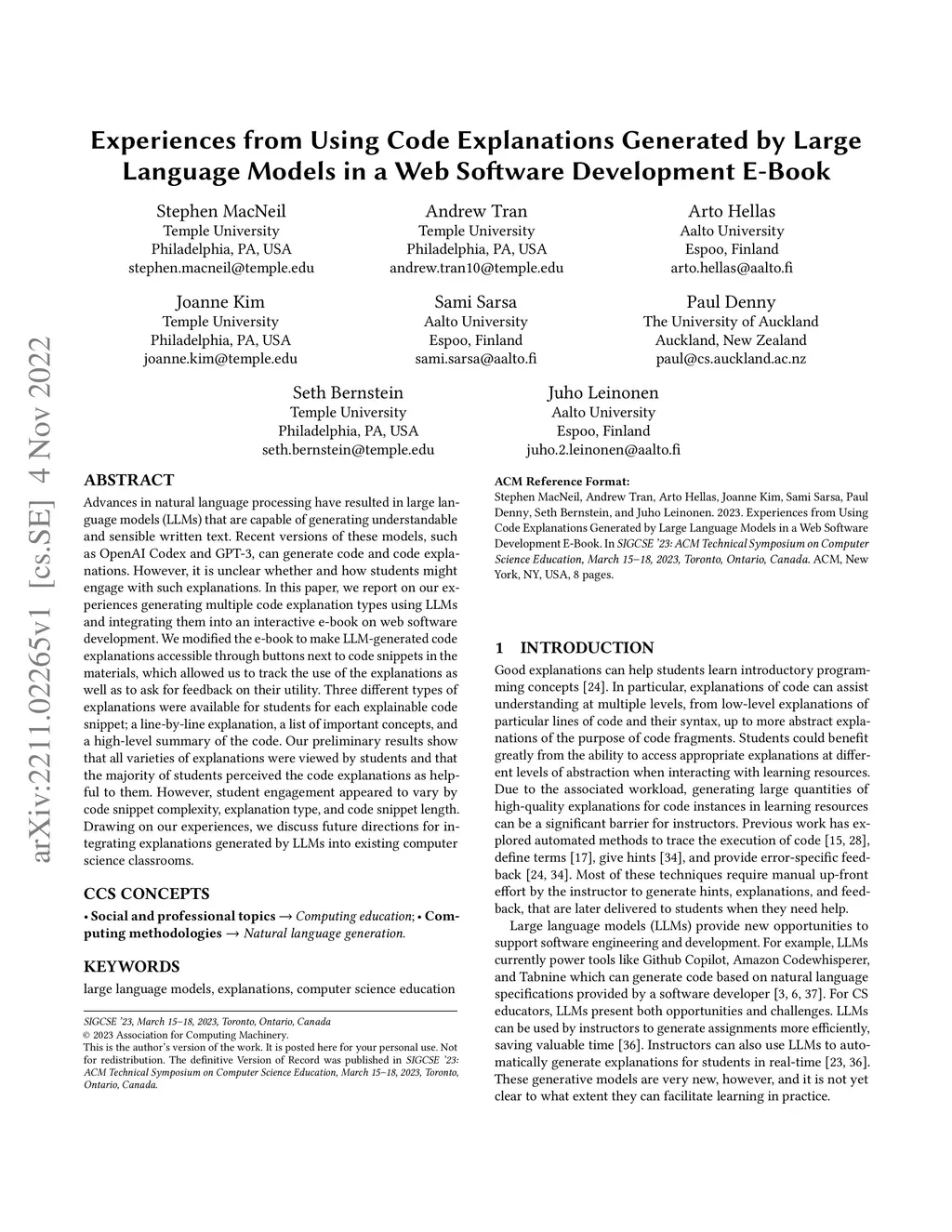 Advances in natural language processing have resulted in large language models (LLMs) that are capable of generating understandable and sensible written text. Recent versions of these models, such as OpenAI Codex and GPT-3, can generate code and code explanations. However, it is unclear whether and how students might engage with such explanations. In this paper, we report on our experiences generating multiple code explanation types using LLMs and integrating them into an interactive e-book on web software development. We modified the e-book to make LLM-generated code explanations accessible through buttons next to code snippets in the materials, which allowed us to track the use of the explanations as well as to ask for feedback on their utility. Three different types of explanations were available for students for each explainable code snippet; a line-by-line explanation, a list of important concepts, and a high-level summary of the code. Our preliminary results show that all varieties of explanations were viewed by students and that the majority of students perceived the code explanations as helpful to them. However, student engagement appeared to vary by code snippet complexity, explanation type, and code snippet length. Drawing on our experiences, we discuss future directions for integrating explanations generated by LLMs into existing computer science classrooms.