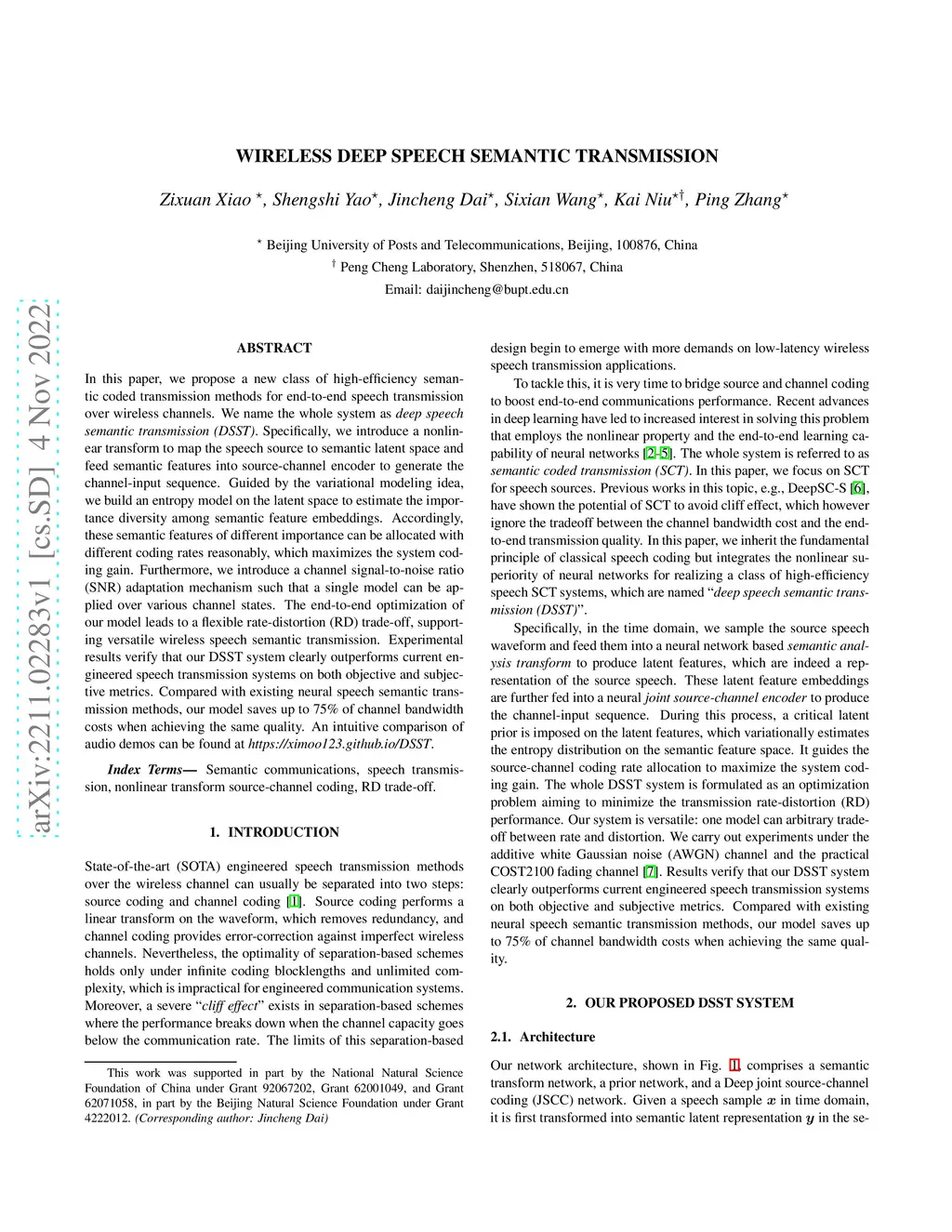 In this paper, we propose a new class of high-efficiency semantic coded transmission methods for end-to-end speech transmission over wireless channels. We name the whole system as deep speech semantic transmission (DSST). Specifically, we introduce a nonlinear transform to map the speech source to semantic latent space and feed semantic features into source-channel encoder to generate the channel-input sequence. Guided by the variational modeling idea, we build an entropy model on the latent space to estimate the importance diversity among semantic feature embeddings. Accordingly, these semantic features of different importance can be allocated with different coding rates reasonably, which maximizes the system coding gain. Furthermore, we introduce a channel signal-to-noise ratio (SNR) adaptation mechanism such that a single model can be applied over various channel states. The end-to-end optimization of our model leads to a flexible rate-distortion (RD) trade-off, supporting versatile wireless speech semantic transmission. Experimental results verify that our DSST system clearly outperforms current engineered speech transmission systems on both objective and subjective metrics. Compared with existing neural speech semantic transmission methods, our model saves up to 75% of channel bandwidth costs when achieving the same quality. An intuitive comparison of audio demos can be found at https://ximoo123.github.io/DSST.