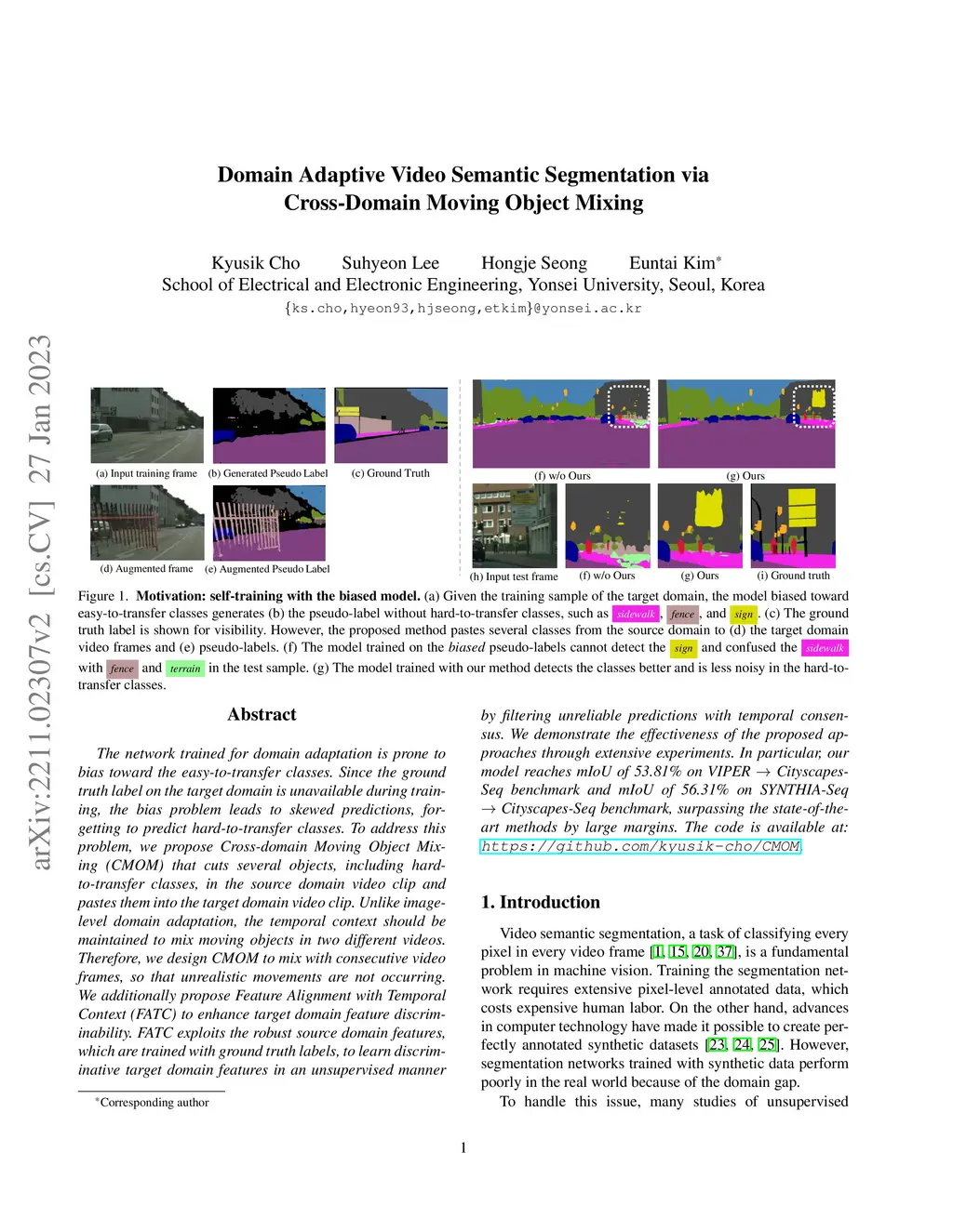 The network trained for domain adaptation is prone to bias toward the easy-to-transfer classes. Since the ground truth label on the target domain is unavailable during training, the bias problem leads to skewed predictions, forgetting to predict hard-to-transfer classes. To address this problem, we propose Cross-domain Moving Object Mixing (CMOM) that cuts several objects, including hard-to-transfer classes, in the source domain video clip and pastes them into the target domain video clip. Unlike image-level domain adaptation, the temporal context should be maintained to mix moving objects in two different videos. Therefore, we design CMOM to mix with consecutive video frames, so that unrealistic movements are not occurring. We additionally propose Feature Alignment with Temporal Context (FATC) to enhance target domain feature discriminability. FATC exploits the robust source domain features, which are trained with ground truth labels, to learn discriminative target domain features in an unsupervised manner by filtering unreliable predictions with temporal consensus. We demonstrate the effectiveness of the proposed approaches through extensive experiments. In particular, our model reaches mIoU of 53.81% on VIPER to Cityscapes-Seq benchmark and mIoU of 56.31% on SYNTHIA-Seq to Cityscapes-Seq benchmark, surpassing the state-of-the-art methods by large margins. The code is available at: https://github.com/kyusik-cho/CMOM.