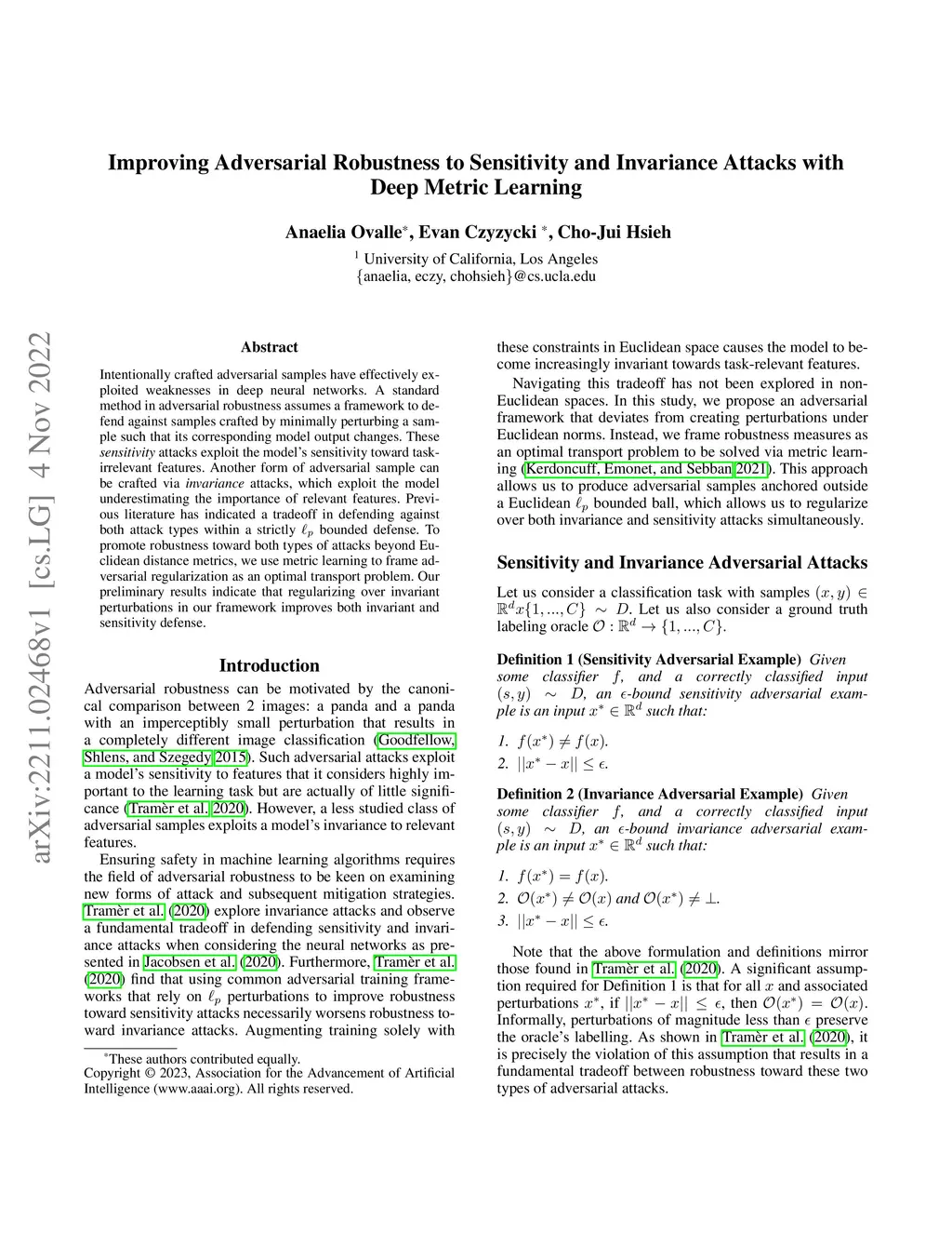 Intentionally crafted adversarial samples have effectively exploited weaknesses in deep neural networks. A standard method in adversarial robustness assumes a framework to defend against samples crafted by minimally perturbing a sample such that its corresponding model output changes. These sensitivity attacks exploit the model's sensitivity toward task-irrelevant features. Another form of adversarial sample can be crafted via invariance attacks, which exploit the model underestimating the importance of relevant features. Previous literature has indicated a tradeoff in defending against both attack types within a strictly L_p bounded defense. To promote robustness toward both types of attacks beyond Euclidean distance metrics, we use metric learning to frame adversarial regularization as an optimal transport problem. Our preliminary results indicate that regularizing over invariant perturbations in our framework improves both invariant and sensitivity defense.
