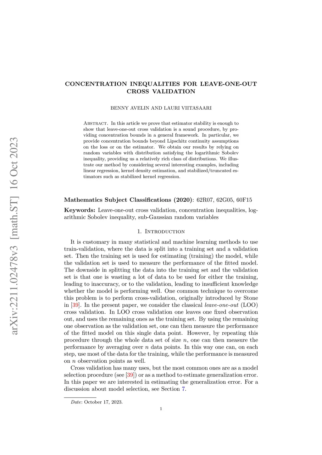 In this article we prove that estimator stability is enough to show that leave-one-out cross validation is a sound procedure, by providing concentration bounds in a general framework. In particular, we provide concentration bounds beyond Lipschitz continuity assumptions on the loss or on the estimator. We obtain our results by relying on random variables with distribution satisfying the logarithmic Sobolev inequality, providing us a relatively rich class of distributions. We illustrate our method by considering several interesting examples, including linear regression, kernel density estimation, and stabilized/truncated estimators such as stabilized kernel regression.