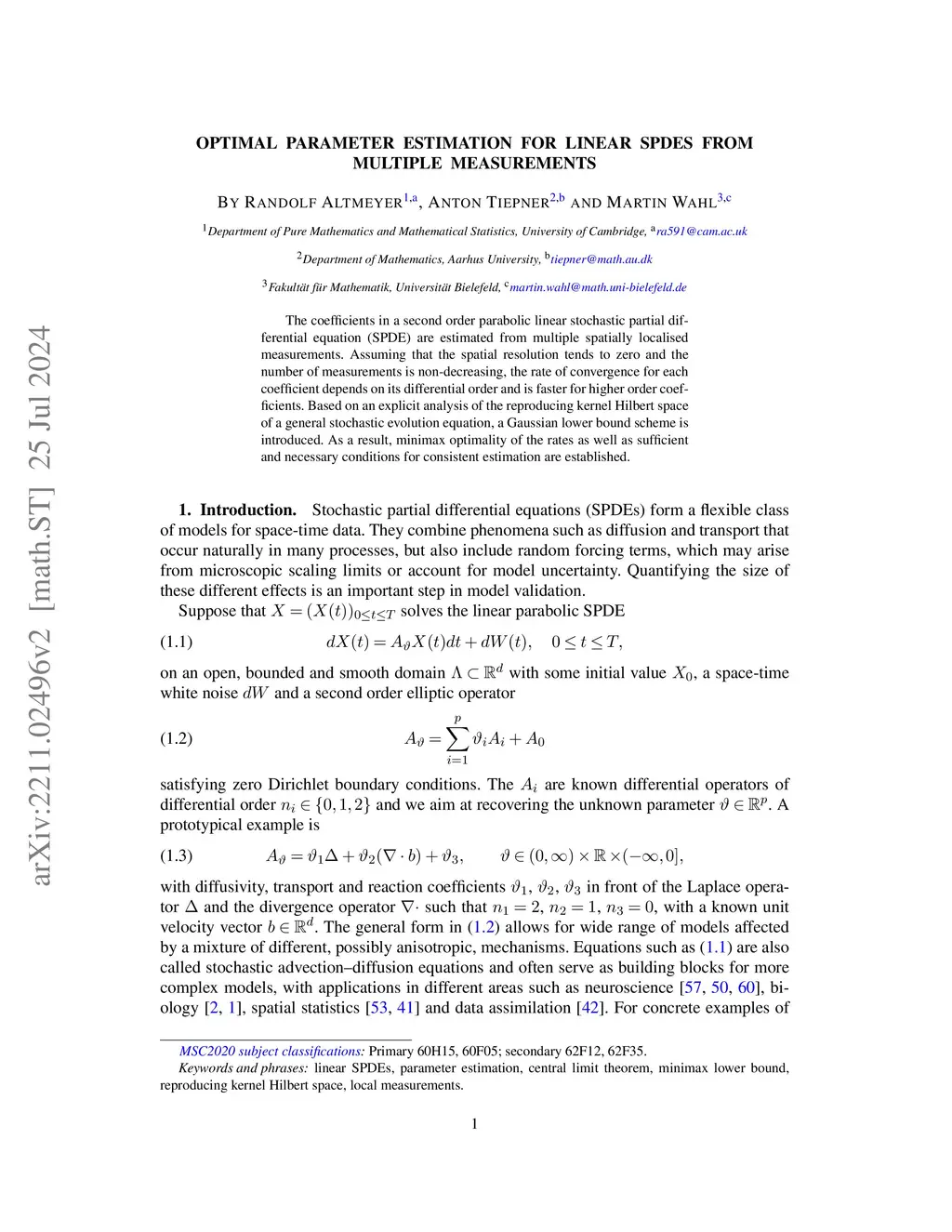 The coefficients in a general second order linear stochastic partial differential equation (SPDE) are estimated from multiple spatially localised measurements. Assuming that the spatial resolution tends to zero and the number of measurements is non-decreasing, the rate of convergence for each coefficient depends on the order of the parametrised differential operator and is faster for higher order coefficients. Based on an explicit analysis of the reproducing kernel Hilbert space of a general stochastic evolution equation, a Gaussian lower bound scheme is introduced. As a result, minimax optimality of the rates as well as sufficient and necessary conditions for consistent estimation are established.
