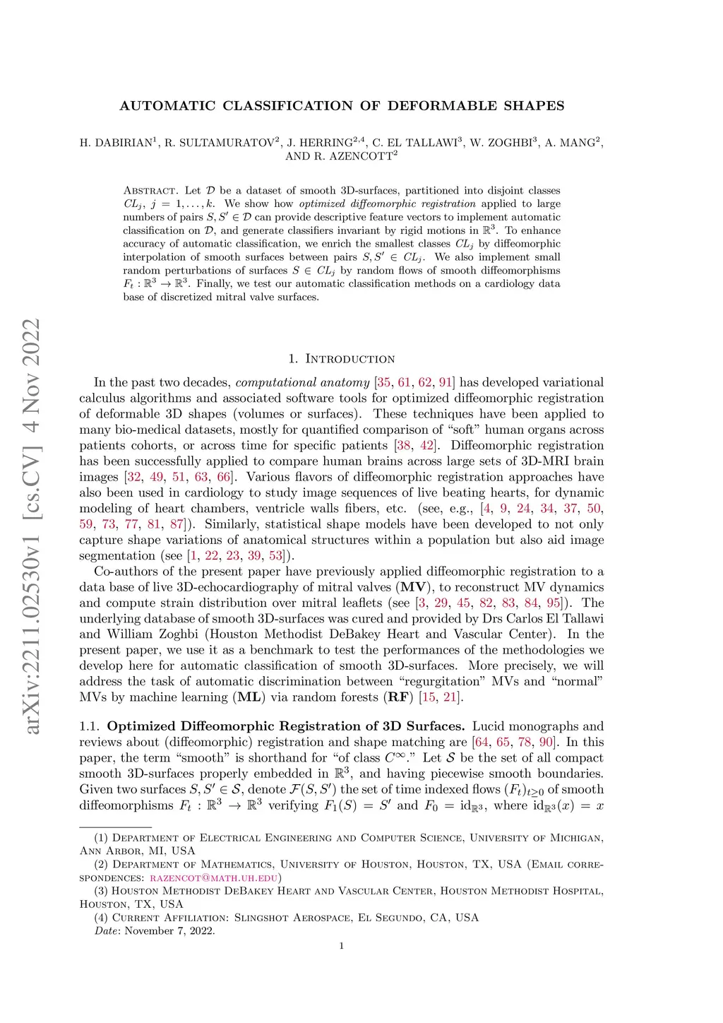Let be a dataset of smooth 3D-surfaces, partitioned into disjoint classes , . We show how optimized diffeomorphic registration applied to large numbers of pairs can provide descriptive feature vectors to implement automatic classification on , and generate classifiers invariant by rigid motions in . To enhance accuracy of automatic classification, we enrich the smallest classes by diffeomorphic interpolation of smooth surfaces between pairs . We also implement small random perturbations of surfaces by random flows of smooth diffeomorphisms . Finally, we test our automatic classification methods on a cardiology data base of discretized mitral valve surfaces.