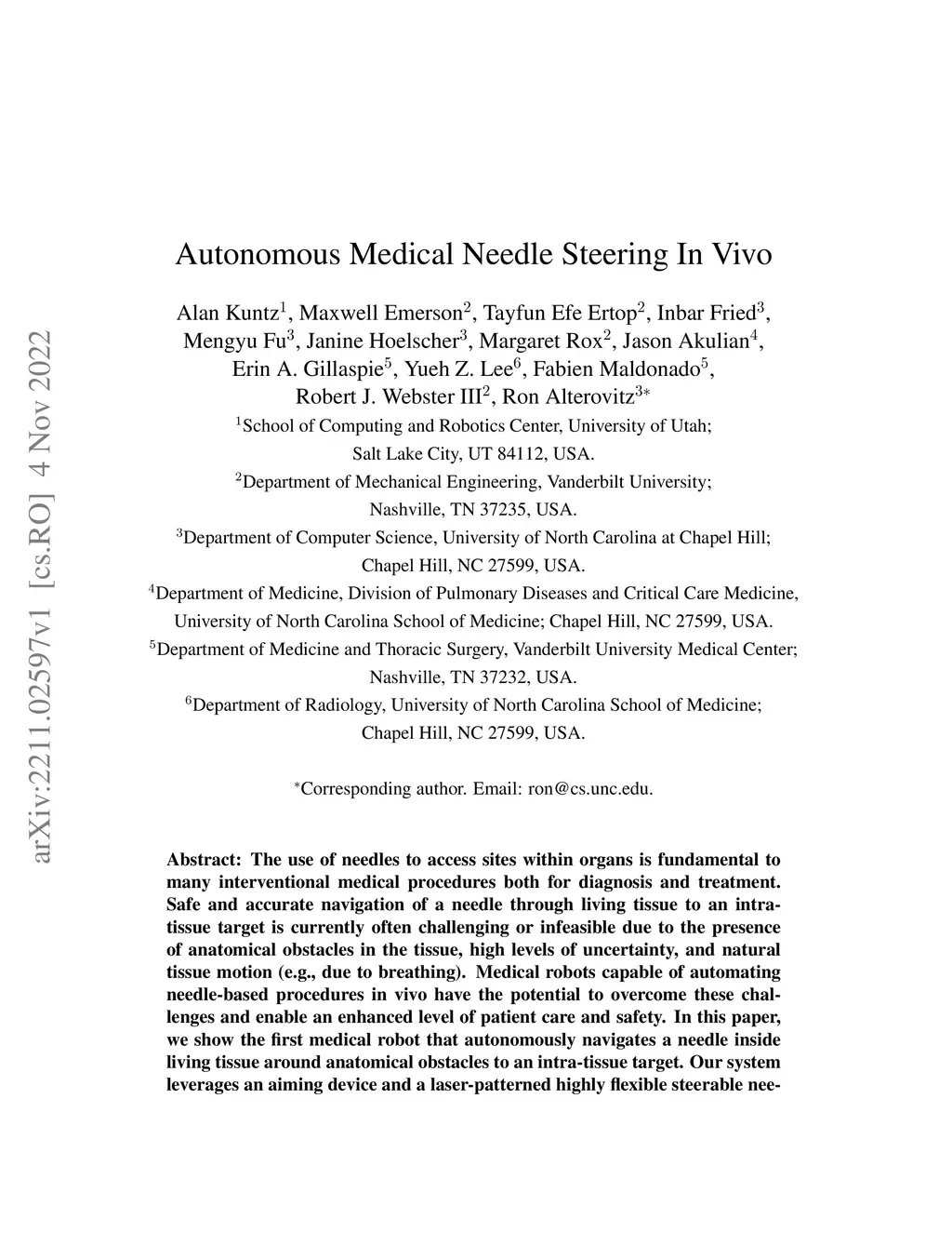 The use of needles to access sites within organs is fundamental to many interventional medical procedures both for diagnosis and treatment. Safe and accurate navigation of a needle through living tissue to an intra-tissue target is currently often challenging or infeasible due to the presence of anatomical obstacles in the tissue, high levels of uncertainty, and natural tissue motion (e.g., due to breathing). Medical robots capable of automating needle-based procedures in vivo have the potential to overcome these challenges and enable an enhanced level of patient care and safety. In this paper, we show the first medical robot that autonomously navigates a needle inside living tissue around anatomical obstacles to an intra-tissue target. Our system leverages an aiming device and a laser-patterned highly flexible steerable needle, a type of needle capable of maneuvering along curvilinear trajectories to avoid obstacles. The autonomous robot accounts for anatomical obstacles and uncertainty in living tissue/needle interaction with replanning and control and accounts for respiratory motion by defining safe insertion time windows during the breathing cycle. We apply the system to lung biopsy, which is critical in the diagnosis of lung cancer, the leading cause of cancer-related death in the United States. We demonstrate successful performance of our system in multiple in vivo porcine studies and also demonstrate that our approach leveraging autonomous needle steering outperforms a standard manual clinical technique for lung nodule access.
