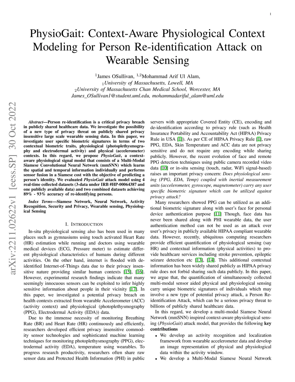 Person re-identification is a critical privacy breach in publicly shared healthcare data. We investigate the possibility of a new type of privacy threat on publicly shared privacy insensitive large scale wearable sensing data. In this paper, we investigate user specific biometric signatures in terms of two contextual biometric traits, physiological (photoplethysmography and electrodermal activity) and physical (accelerometer) contexts. In this regard, we propose PhysioGait, a context-aware physiological signal model that consists of a Multi-Modal Siamese Convolutional Neural Network (mmSNN) which learns the spatial and temporal information individually and performs sensor fusion in a Siamese cost with the objective of predicting a person's identity. We evaluated PhysioGait attack model using 4 real-time collected datasets (3-data under IRB #HP-00064387 and one publicly available data) and two combined datasets achieving 89% - 93% accuracy of re-identifying persons.