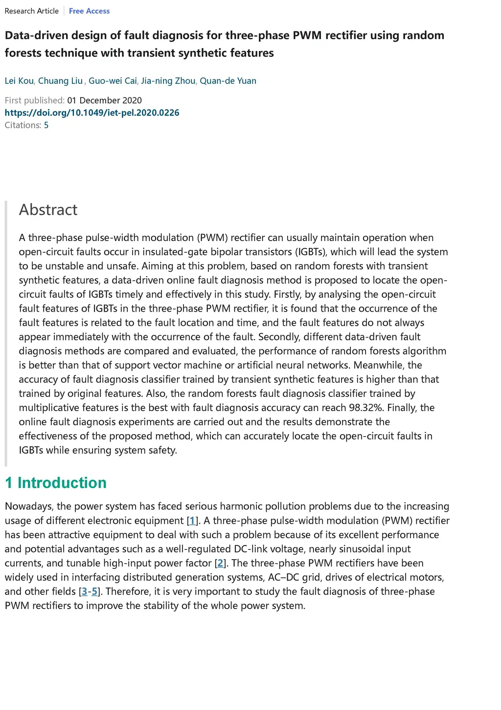 A three-phase pulse-width modulation (PWM) rectifier can usually maintain operation when open-circuit faults occur in insulated-gate bipolar transistors (IGBTs), which will lead the system to be unstable and unsafe. Aiming at this problem, based on random forests with transient synthetic features, a data-driven online fault diagnosis method is proposed to locate the open-circuit faults of IGBTs timely and effectively in this study. Firstly, by analysing the open-circuit fault features of IGBTs in the three-phase PWM rectifier, it is found that the occurrence of the fault features is related to the fault location and time, and the fault features do not always appear immediately with the occurrence of the fault. Secondly, different data-driven fault diagnosis methods are compared and evaluated, the performance of random forests algorithm is better than that of support vector machine or artificial neural networks. Meanwhile, the accuracy of fault diagnosis classifier trained by transient synthetic features is higher than that trained by original features. Also, the random forests fault diagnosis classifier trained by multiplicative features is the best with fault diagnosis accuracy can reach 98.32%. Finally, the online fault diagnosis experiments are carried out and the results demonstrate the effectiveness of the proposed method, which can accurately locate the open-circuit faults in IGBTs while ensuring system safety.