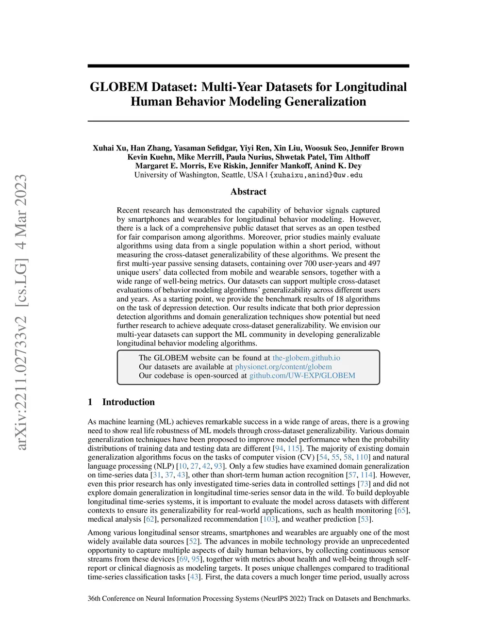GLOBEM Dataset: Multi-Year Datasets for Longitudinal Human Behavior