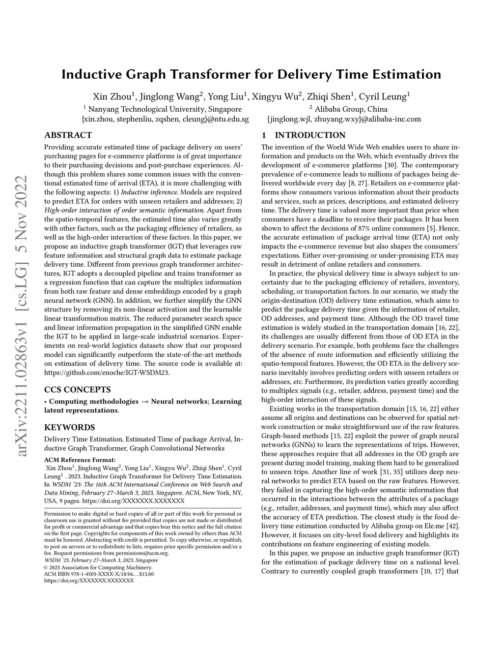 Providing accurate estimated time of package delivery on users' purchasing pages for e-commerce platforms is of great importance to their purchasing decisions and post-purchase experiences. Although this problem shares some common issues with the conventional estimated time of arrival (ETA), it is more challenging with the following aspects: 1) Inductive inference. Models are required to predict ETA for orders with unseen retailers and addresses; 2) High-order interaction of order semantic information. Apart from the spatio-temporal features, the estimated time also varies greatly with other factors, such as the packaging efficiency of retailers, as well as the high-order interaction of these factors. In this paper, we propose an inductive graph transformer (IGT) that leverages raw feature information and structural graph data to estimate package delivery time. Different from previous graph transformer architectures, IGT adopts a decoupled pipeline and trains transformer as a regression function that can capture the multiplex information from both raw feature and dense embeddings encoded by a graph neural network (GNN). In addition, we further simplify the GNN structure by removing its non-linear activation and the learnable linear transformation matrix. The reduced parameter search space and linear information propagation in the simplified GNN enable the IGT to be applied in large-scale industrial scenarios. Experiments on real-world logistics datasets show that our proposed model can significantly outperform the state-of-the-art methods on estimation of delivery time. The source code is available at: https://github.com/enoche/IGT-WSDM23.