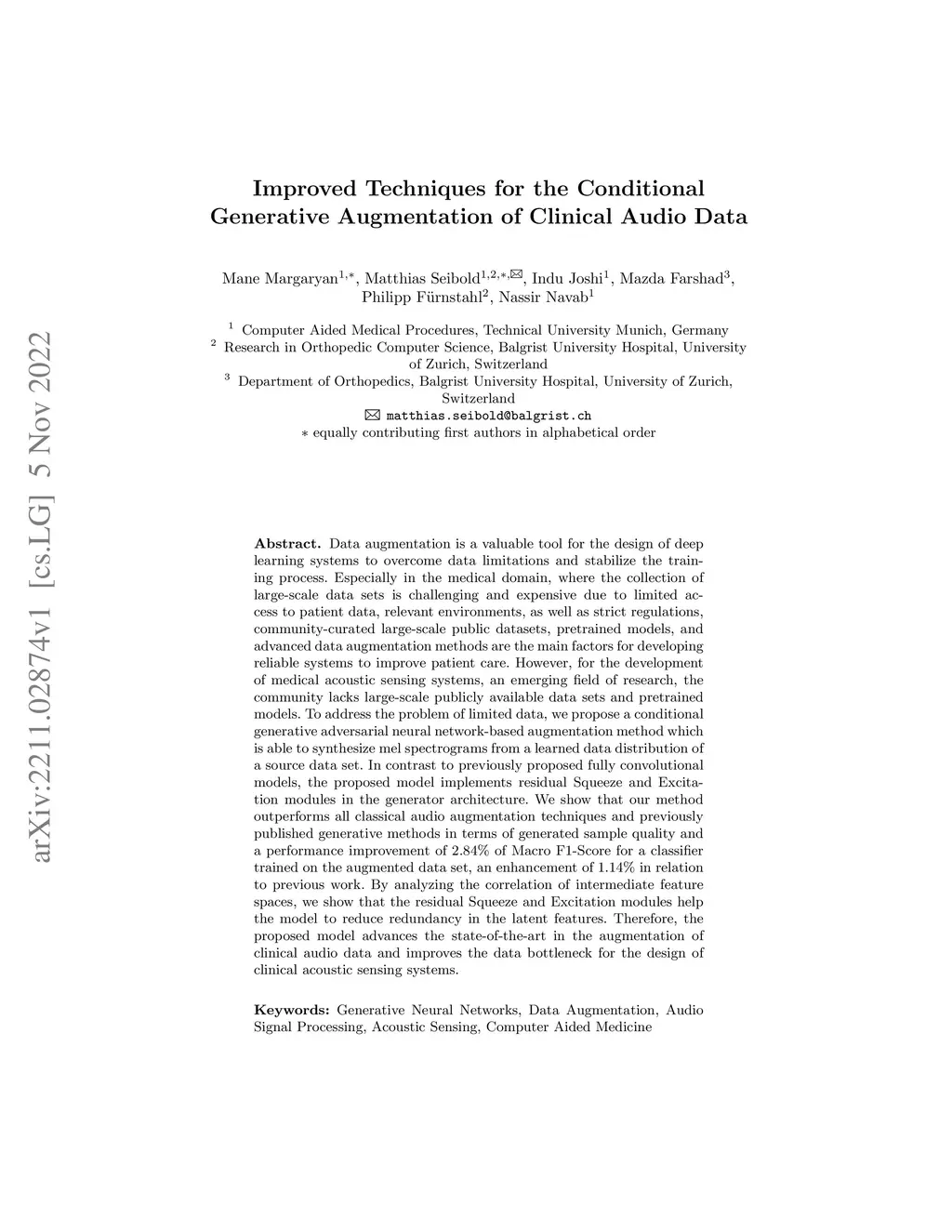 Data augmentation is a valuable tool for the design of deep learning systems to overcome data limitations and stabilize the training process. Especially in the medical domain, where the collection of large-scale data sets is challenging and expensive due to limited access to patient data, relevant environments, as well as strict regulations, community-curated large-scale public datasets, pretrained models, and advanced data augmentation methods are the main factors for developing reliable systems to improve patient care. However, for the development of medical acoustic sensing systems, an emerging field of research, the community lacks large-scale publicly available data sets and pretrained models. To address the problem of limited data, we propose a conditional generative adversarial neural network-based augmentation method which is able to synthesize mel spectrograms from a learned data distribution of a source data set. In contrast to previously proposed fully convolutional models, the proposed model implements residual Squeeze and Excitation modules in the generator architecture. We show that our method outperforms all classical audio augmentation techniques and previously published generative methods in terms of generated sample quality and a performance improvement of 2.84% of Macro F1-Score for a classifier trained on the augmented data set, an enhancement of in relation to previous work. By analyzing the correlation of intermediate feature spaces, we show that the residual Squeeze and Excitation modules help the model to reduce redundancy in the latent features. Therefore, the proposed model advances the state-of-the-art in the augmentation of clinical audio data and improves the data bottleneck for the design of clinical acoustic sensing systems.