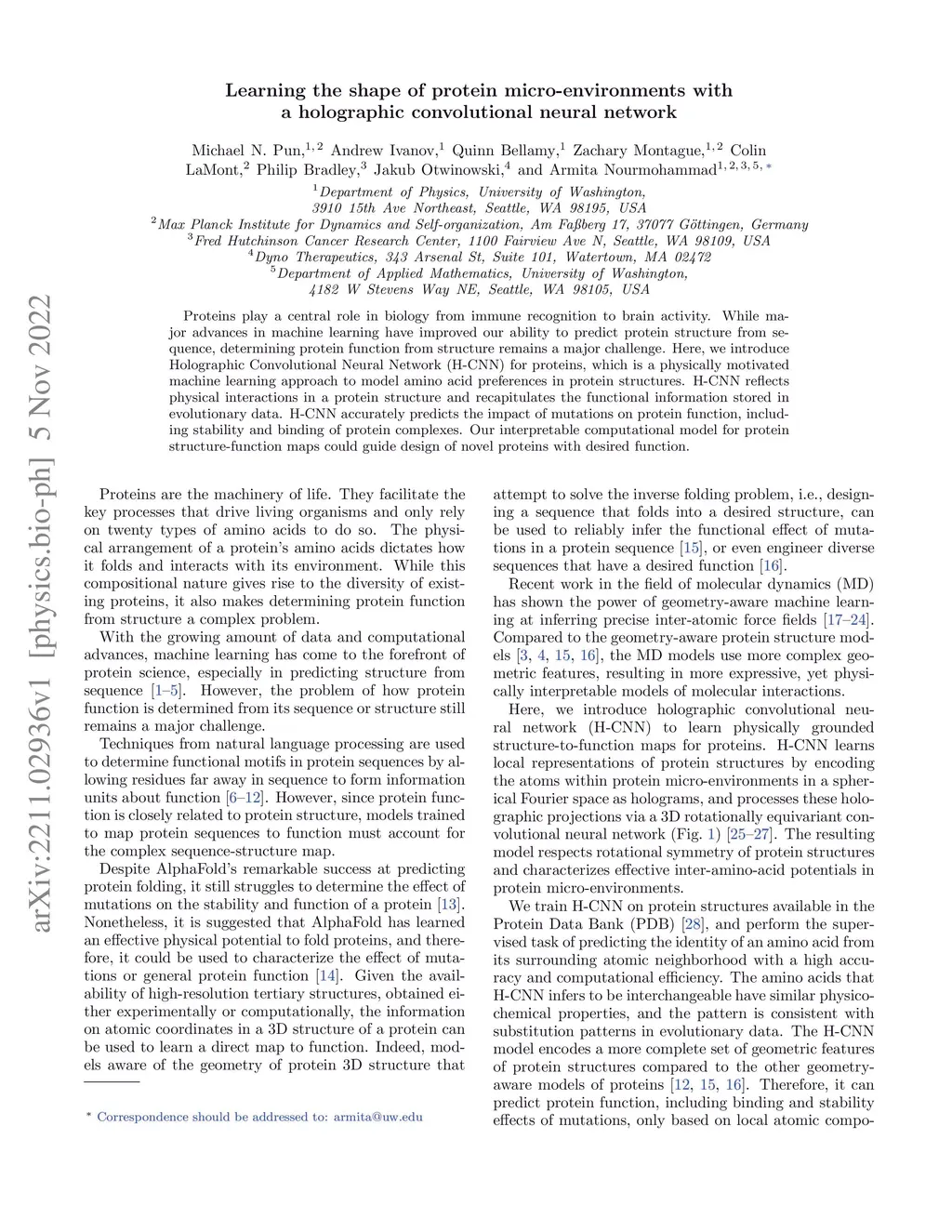 Proteins play a central role in biology from immune recognition to brain activity. While major advances in machine learning have improved our ability to predict protein structure from sequence, determining protein function from structure remains a major challenge. Here, we introduce Holographic Convolutional Neural Network (H-CNN) for proteins, which is a physically motivated machine learning approach to model amino acid preferences in protein structures. H-CNN reflects physical interactions in a protein structure and recapitulates the functional information stored in evolutionary data. H-CNN accurately predicts the impact of mutations on protein function, including stability and binding of protein complexes. Our interpretable computational model for protein structure-function maps could guide design of novel proteins with desired function.